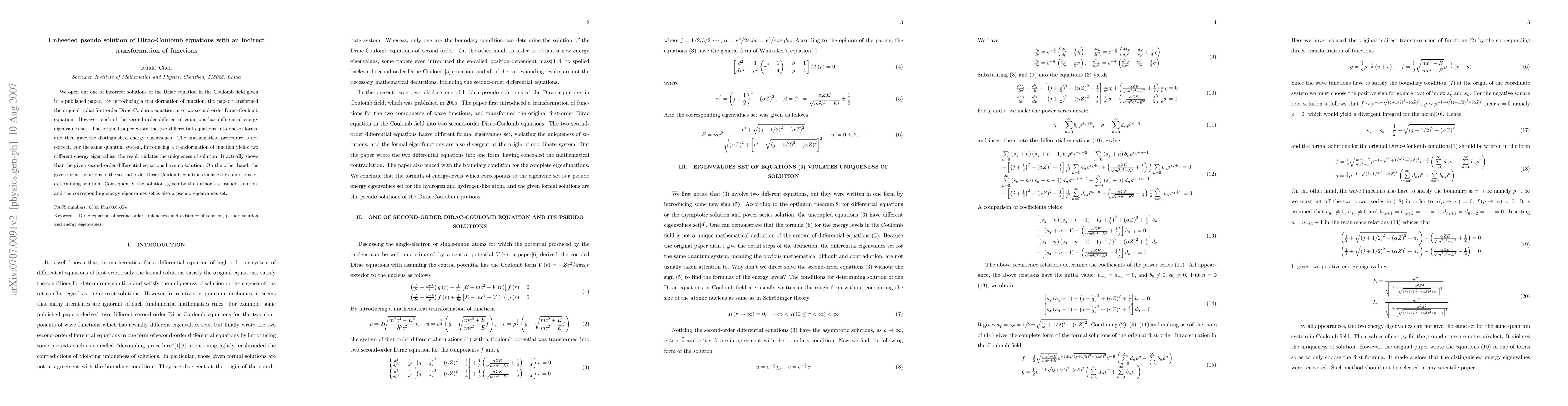 We open out one of incorrect solutions of the Driac equation in the Coulomb field given in a published paper. By introducing a transformation of function, the paper transformed the original radial first-order Dirac-Coulomb equation into two second-order Dirac-Coulomb equation. However, each of the second-order differential equations has differential energy eigenvalues set. The original paper wrote the two differential equations into one of forms, and then gave the distinguished energy eigenvalues. The mathematical procedure is not correct. For the same quantum system, introducing a transformation of function yields two different energy eigenvaluse, the result violates the uniqueness of solution. It actually shows that the given second-order differential equations have no solution. On the other hand, the given formal solutions of the second-order Dirac-Coulomb equations violate the conditions for determining solution. Consequently, the solutions given by the author are pseudo solution, and the corresponding energy eigenvalues set is also a pseudo eigenvalues set.