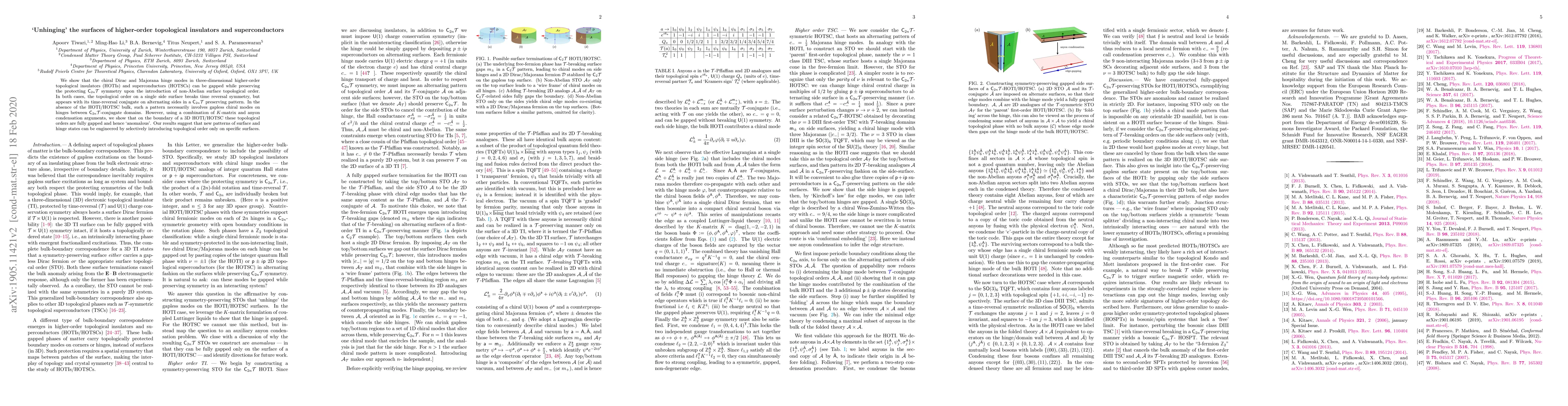 The paper introduces a novel approach to gapping hinge modes in HOTIs/HOTSCs by leveraging non-Abelian surface topological orders and $\mathsf{C}_{2n}\mathcal T$ symmetry preservation.
