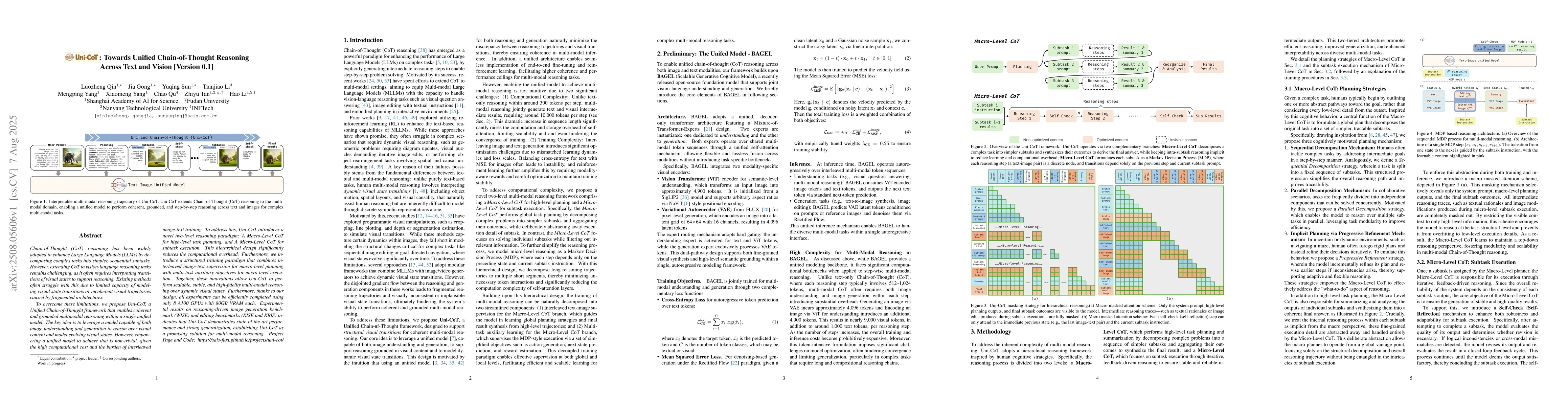 Chain-of-Thought (CoT) reasoning has been widely adopted to enhance Large Language Models (LLMs) by decomposing complex tasks into simpler, sequential subtasks. However, extending CoT to vision-language reasoning tasks remains challenging, as it often requires interpreting transitions of visual states to support reasoning. Existing methods often struggle with this due to limited capacity of modeling visual state transitions or incoherent visual trajectories caused by fragmented architectures. To overcome these limitations, we propose Uni-CoT, a Unified Chain-of-Thought framework that enables coherent and grounded multimodal reasoning within a single unified model. The key idea is to leverage a model capable of both image understanding and generation to reason over visual content and model evolving visual states. However, empowering a unified model to achieve that is non-trivial, given the high computational cost and the burden of training. To address this, Uni-CoT introduces a novel two-level reasoning paradigm: A Macro-Level CoT for high-level task planning and A Micro-Level CoT for subtask execution. This design significantly reduces the computational overhead. Furthermore, we introduce a structured training paradigm that combines interleaved image-text supervision for macro-level CoT with multi-task objectives for micro-level CoT. Together, these innovations allow Uni-CoT to perform scalable and coherent multi-modal reasoning. Furthermore, thanks to our design, all experiments can be efficiently completed using only 8 A100 GPUs with 80GB VRAM each. Experimental results on reasoning-driven image generation benchmark (WISE) and editing benchmarks (RISE and KRIS) indicates that Uni-CoT demonstrates SOTA performance and strong generalization, establishing Uni-CoT as a promising solution for multi-modal reasoning. Project Page and Code: https://sais-fuxi.github.io/projects/uni-cot/