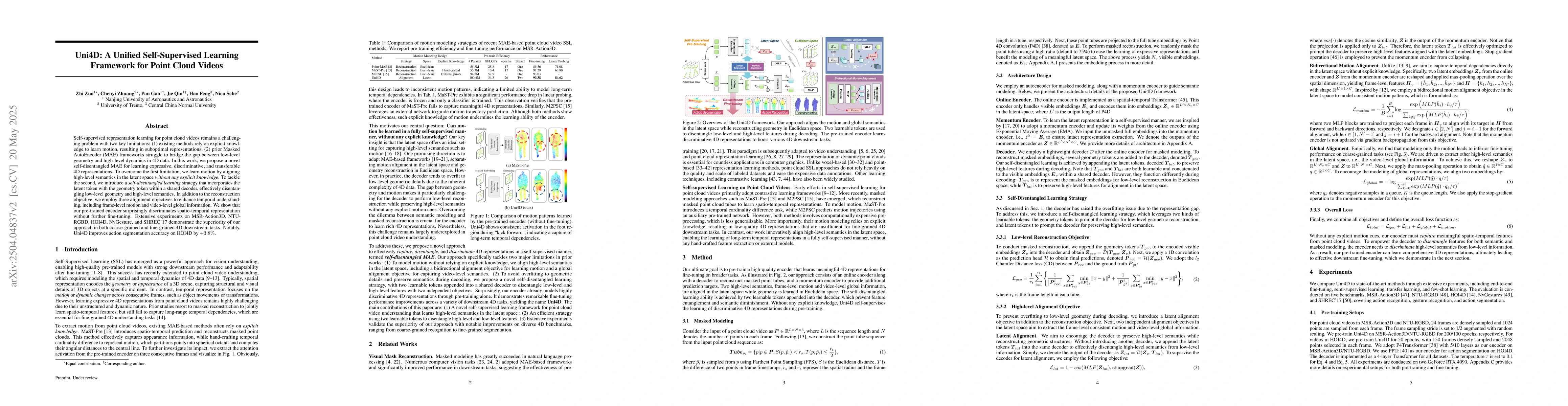 Uni4D is the first self-disentangled MAE for point cloud video representation learning, addressing key limitations in 4D modeling by aligning high-level semantics in the latent space and reconstructing geometry in Euclidean space.