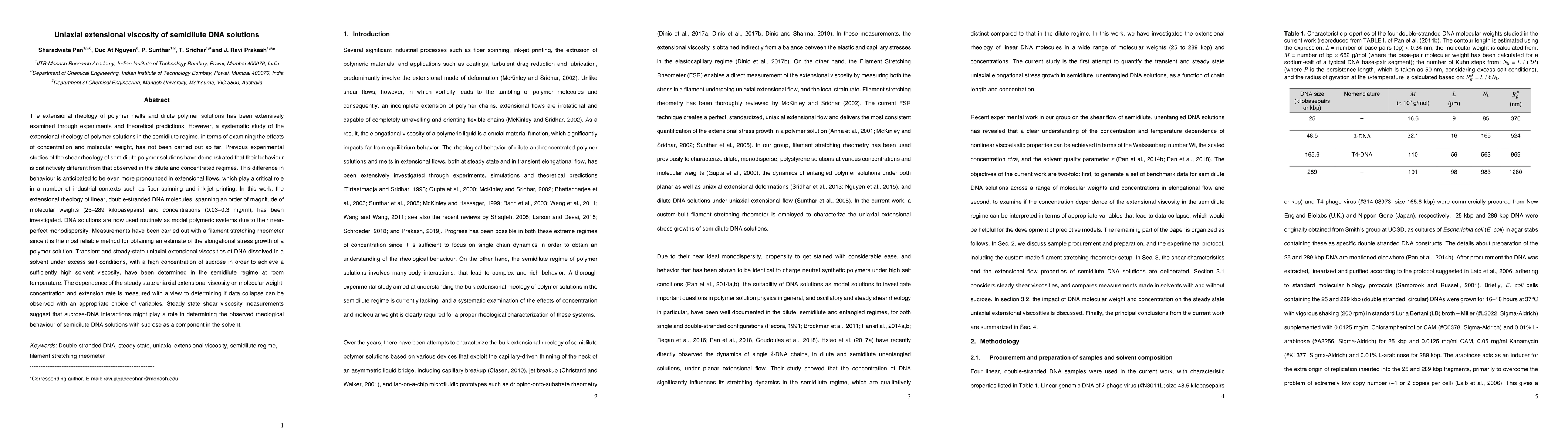 The extensional rheology of polymeric liquids has been extensively examined through experiments and theoretical predictions. However, a systematic study of the extensional rheology of polymer solutions in the semidilute regime, in terms of examining the effects of concentration and molecular weight, has not been carried out so far. Prior studies of the shear rheology of semidilute polymer solutions have demonstrated that their behaviour is distinctively different from that observed in the dilute and concentrated regimes. This difference in behaviour is anticipated to be even more pronounced in extensional flows. In this work, the extensional rheology of linear, double-stranded DNA molecules, spanning an order of magnitude of molecular weights (25 to 289 kilobasepairs) and concentrations (0.03 to 0.3 mg/ml), has been investigated. DNA solutions are now used routinely as model polymeric systems due to their near-perfect monodispersity. Measurements have been carried out with a filament stretching rheometer since it is the most reliable method for obtaining an estimate of the elongational stress growth of a polymer solution. Transient and steady-state uniaxial extensional viscosities of DNA dissolved in a solvent under excess salt conditions, with a high concentration of sucrose in order to achieve a sufficiently high solvent viscosity, have been determined in the semidilute regime at room temperature. The dependence of the steady state uniaxial extensional viscosity on molecular weight, concentration and extension rate is measured with a view to determining if data collapse can be observed with an appropriate choice of variables. Steady state shear viscosity measurements suggest that sucrose-DNA interactions might play a role in determining the observed rheological behaviour of semidilute DNA solutions with sucrose as a component in the solvent.