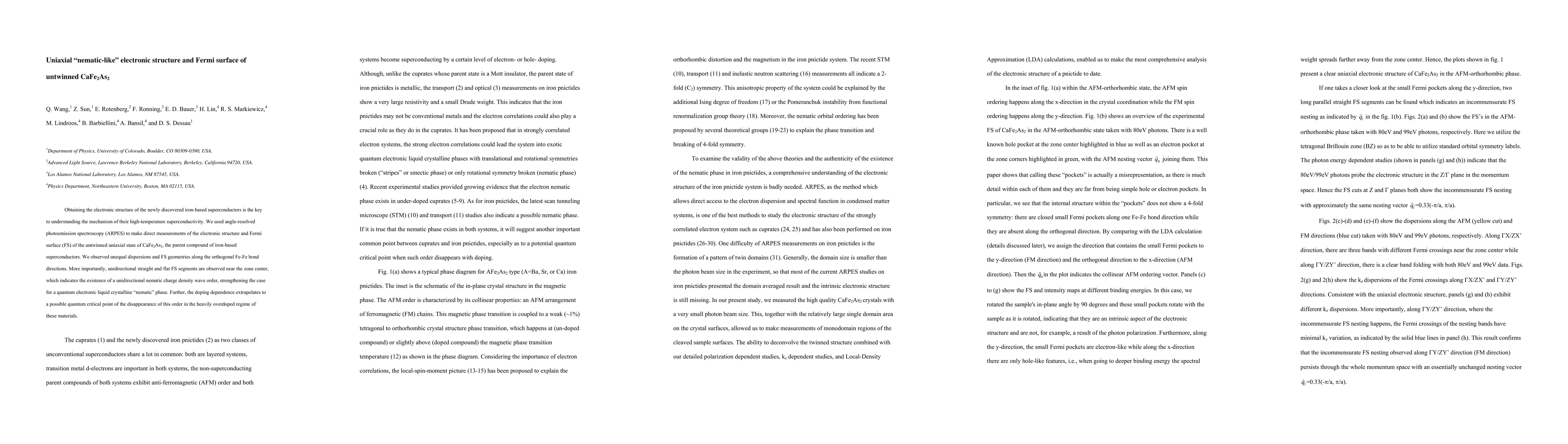 This paper uses ARPES to study the electronic structure and Fermi surface of untwinned CaFe2As2, revealing unequal dispersions and a unique nematic-like charge density wave order, suggesting a quantum liquid crystalline "nematic" phase and hinting at a quantum critical point in heavily doped states.