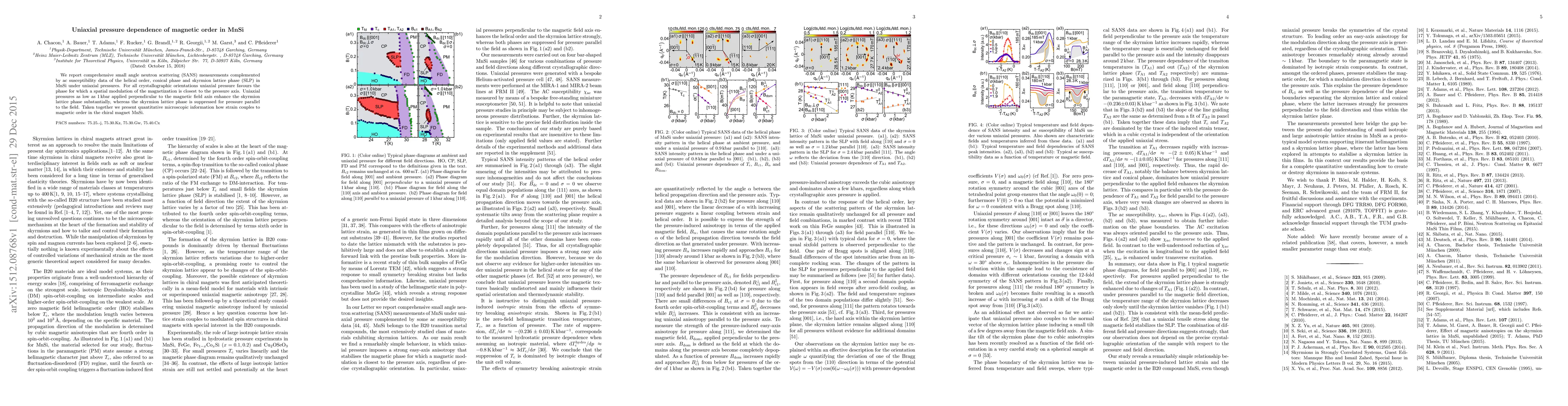 We report comprehensive small angle neutron scattering (SANS) measurements complemented by ac susceptibility data of the helical order, conical phase and skyrmion lattice phase (SLP) in MnSi under uniaxial pressures. For all crystallographic orientations uniaxial pressure favours the phase for which a spatial modulation of the magnetization is closest to the pressure axis. Uniaxial pressures as low as 1kbar applied perpendicular to the magnetic field axis enhance the skyrmion lattice phase substantially, whereas the skyrmion lattice phase is suppressed for pressure parallel to the field. Taken together we present quantitative microscopic information how strain couples to magnetic order in the chiral magnet MnSi.