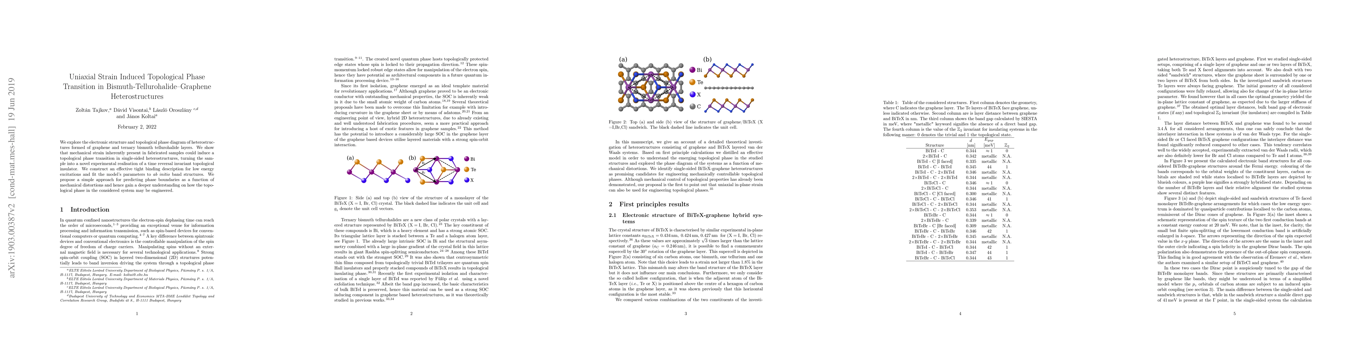 This paper investigates the electronic structure of graphene-bismuth tellurohalide heterostructures, demonstrating that uniaxial strain can induce a topological phase transition, transforming the material into a time reversal invariant topological insulator. The authors develop an effective tight binding model to describe low energy excitations and predict phase boundaries based on mechanical distortions.