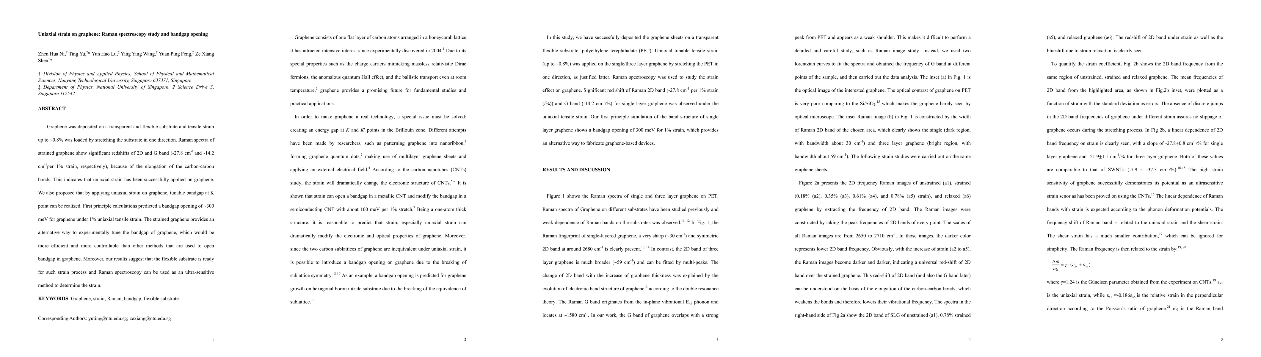 Graphene was deposited on a transparent and flexible substrate and tensile strain up to ~0.8% was loaded by stretching the substrate in one direction. Raman spectra of strained graphene show significant redshifts of 2D and G band (-27.8 cm^-1 and -14.2 cm^-1per 1% strain, respectively), because of the elongation of the carbon-carbon bonds. This indicates that uniaxial strain has been successfully applied on graphene. We also proposed that by applying uniaxial strain on graphene, tunable bandgap at K point can be realized. First principle calculations predicted a bandgap opening of ~300 meV for graphene under 1% uniaxial tensile strain. The strained graphene provides an alternative way to experimentally tune the bandgap of graphene, which would be more efficient and more controllable than other methods that are used to open bandgap in graphene. Moreover, our results suggest that the flexible substrate is ready for such strain process and Raman spectroscopy can be used as an ultra-sensitive method to determine the strain.