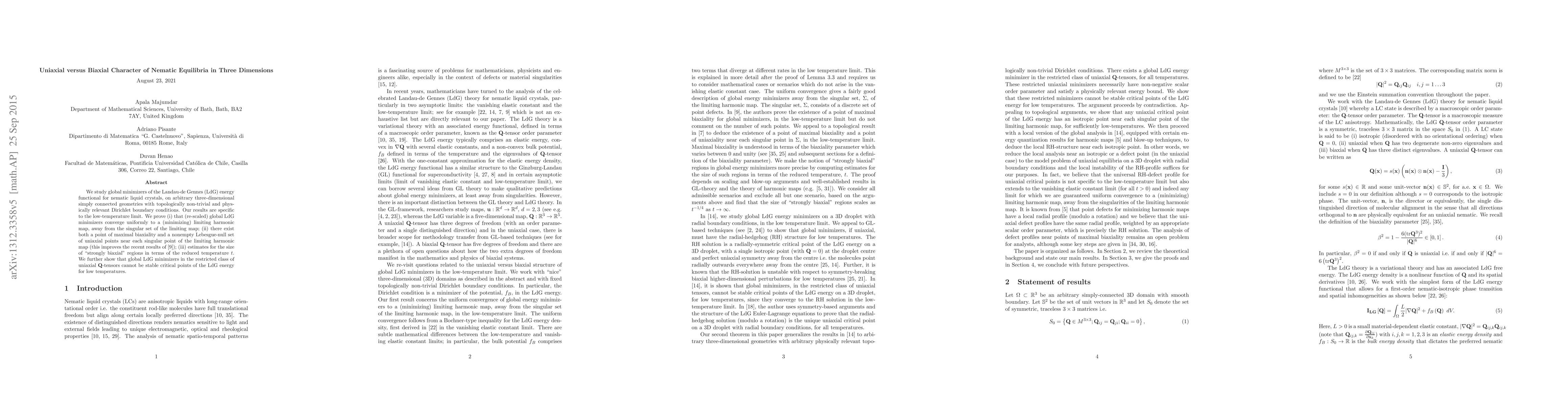 We study global minimizers of the Landau-de Gennes (LdG) energy functional for nematic liquid crystals, on arbitrary three-dimensional simply connected geometries with topologically non-trivial and physically relevant Dirichlet boundary conditions. Our results are specific to the low-temperature limit. We prove (i) that (re-scaled) global LdG minimizers converge uniformly to a (minimizing) limiting harmonic map, away from the singular set of the limiting map; (ii) there exist both a point of maximal biaxiality and a nonempty Lebesgue-null set of uniaxial points near each singular point of the limiting harmonic map (this improves the recent results of \cite{contreraslamy}); (iii) estimates for the size of "strongly biaxial" regions in terms of the reduced temperature $t$. We further show that global LdG minimizers in the restricted class of uniaxial $\Qvec$-tensors cannot be stable critical points of the LdG energy for low temperatures.