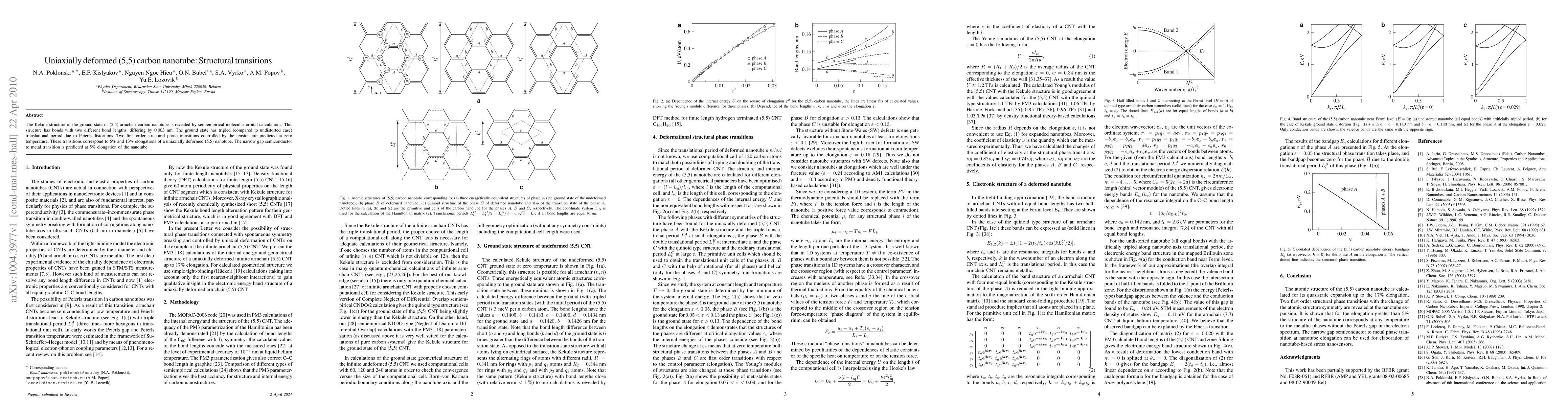 The Kekule structure of the ground state of (5,5) armchair carbon nanotube is revealed by semiempirical molecular orbital calculations. This structure has bonds with two different bond lengths, differing by 0.003 nm. The ground state has tripled (compared to undistorted case) translational period due to Peierls distortions. Two first order structural phase transitions controlled by the tension are predicted at zero temperature. These transitions correspond to 5% and 13% elongations of a uniaxially deformed (5,5) nanotube. The narrow gap semiconductor to metal transition is predicted at 5% elongation of the nanotube.
