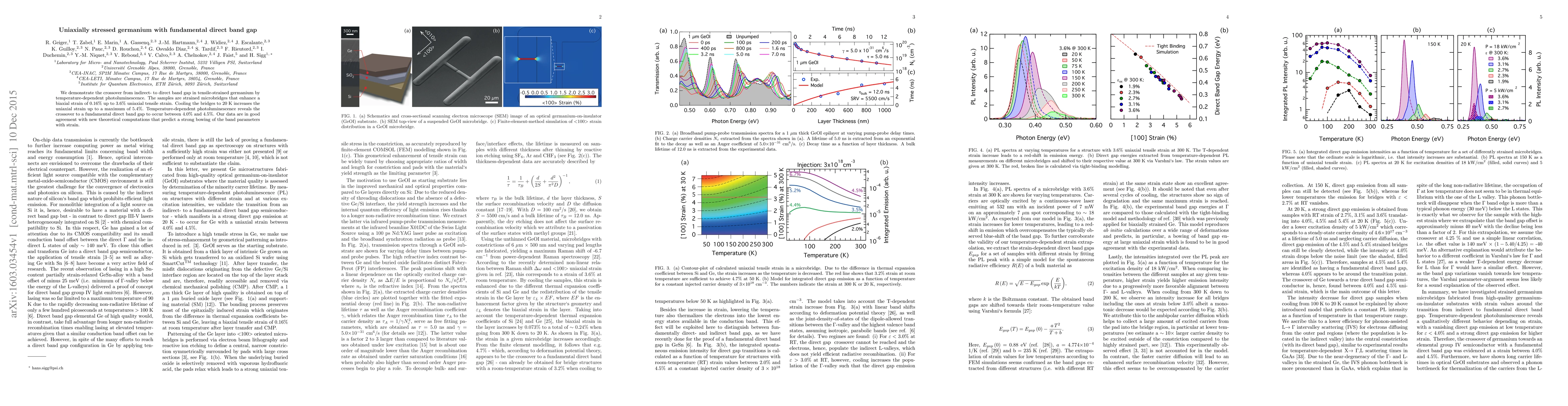 This study demonstrates the transition from indirect to direct band gap in tensile-strained germanium using temperature-dependent photoluminescence, showing the crossover occurs between 4.0% and 4.5% uniaxial strain, corroborated by theoretical computations.