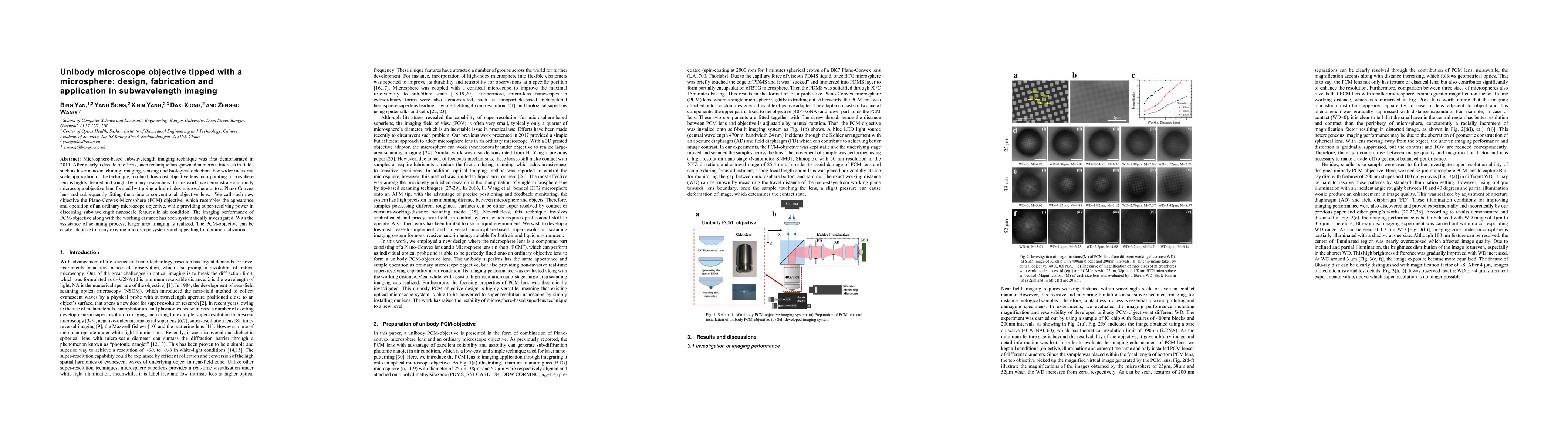 This paper presents the design and fabrication of a novel unibody microscope objective, termed the Plano-Convex-Microsphere (PCM) objective, which integrates a high-index microsphere onto a Plano-Convex lens for subwavelength imaging. The PCM objective offers super-resolving power and can be easily adapted to existing microscope systems, making it a promising candidate for commercial applications in imaging and sensing.