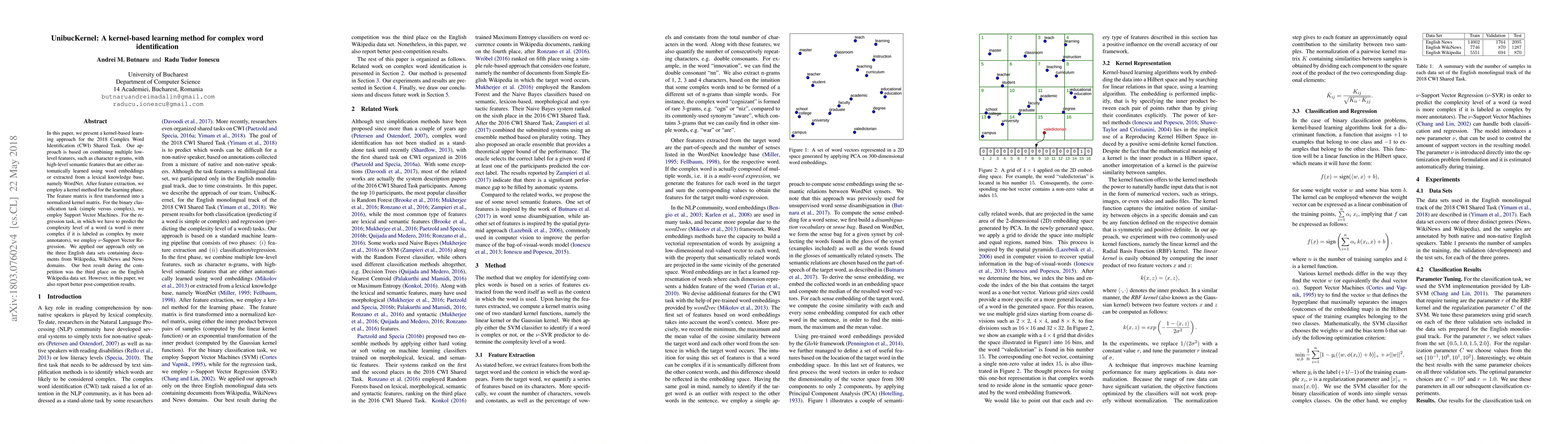 In this paper, we present a kernel-based learning approach for the 2018 Complex Word Identification (CWI) Shared Task. Our approach is based on combining multiple low-level features, such as character n-grams, with high-level semantic features that are either automatically learned using word embeddings or extracted from a lexical knowledge base, namely WordNet. After feature extraction, we employ a kernel method for the learning phase. The feature matrix is first transformed into a normalized kernel matrix. For the binary classification task (simple versus complex), we employ Support Vector Machines. For the regression task, in which we have to predict the complexity level of a word (a word is more complex if it is labeled as complex by more annotators), we employ v-Support Vector Regression. We applied our approach only on the three English data sets containing documents from Wikipedia, WikiNews and News domains. Our best result during the competition was the third place on the English Wikipedia data set. However, in this paper, we also report better post-competition results.