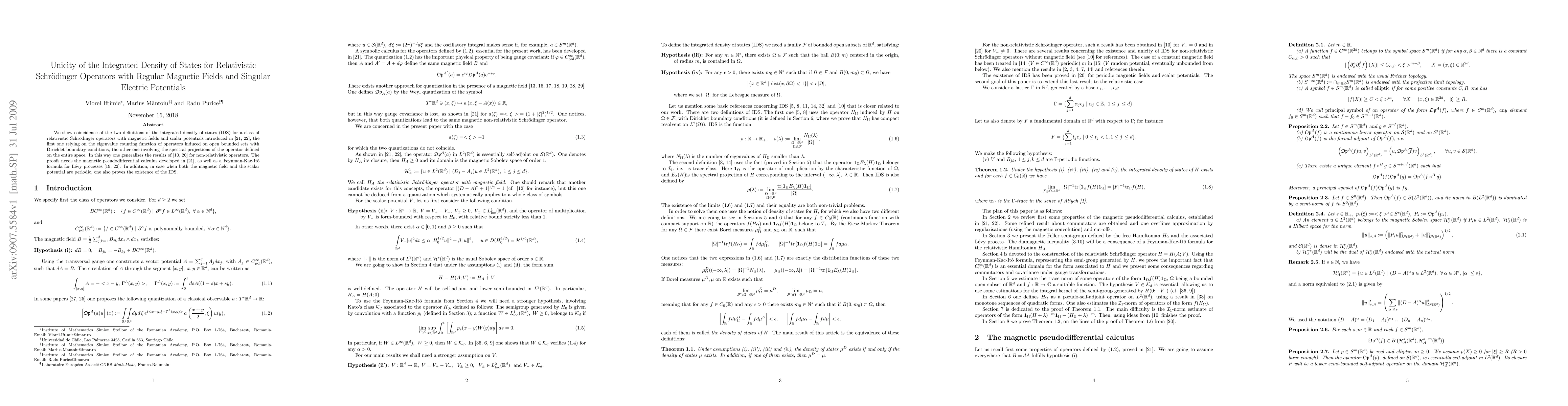 We show coincidence of the two definitions of the integrated density of states (IDS) for a class of relativistic Schroedinger operators with magnetic fields and scalar potentials, the first one relying on the eigenvalue counting function of operators induced on open bounded sets with Dirichlet boundary conditions, the other one involving the spectral projections of the operator defined on the entire space. In this way one generalizes previous results for non-relativistic operators. The proofs needs the magnetic pseudodifferential calculus, as well as a Feynman-Kac-Ito formula for Levy processes. In addition, in case when both the magnetic field and the scalar potential are periodic, one also proves the existence of the IDS.