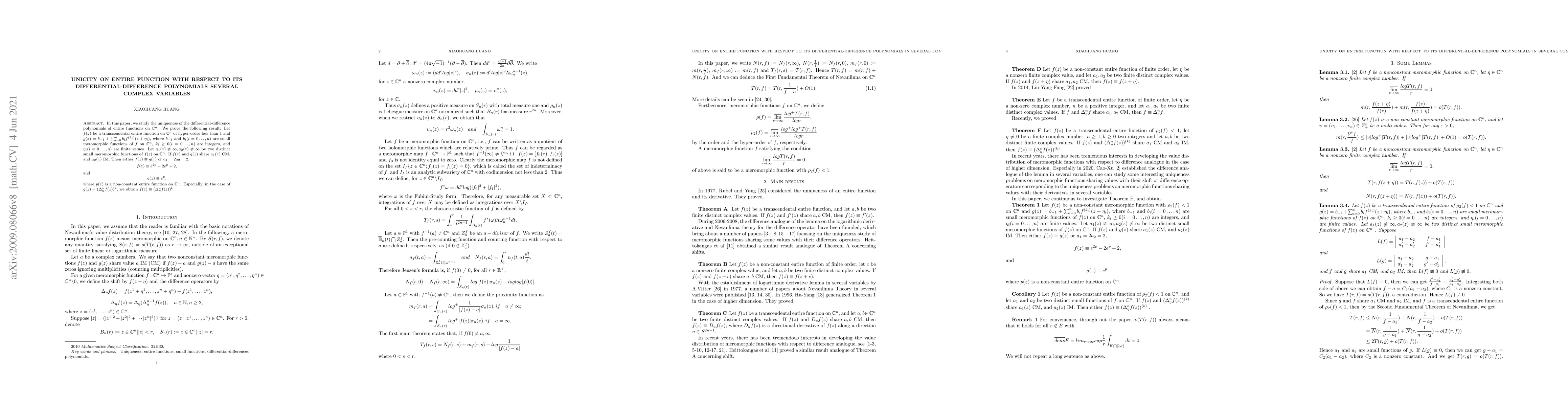 In this paper, we study the uniqueness of the differential-difference polynomials of entire functions on $\mathbb{C}^{n}$. We prove the following result: Let $f(z)$ be a transcendental entire function on $\mathbb{C}^{n}$ of hyper-order less than $1$ and $g(z)=b_{-1}+\sum_{i=0}^{n}b_{i}f^{(k_{i})}(z+\eta_{i})$, where $b_{-1}$ and $b_{i} (i=0\ldots,n)$ are small meromorphic functions of $f$ on $\mathbb{C}^{n}$, $k_{i}\geq0 (i=0\ldots,n)$ are integers, and $\eta_{i} (i=0\ldots,n)$ are finite values. Let $a_{1}(z)\not\equiv\infty, a_{2}(z)\not\equiv\infty$ be two distinct small meromorphic functions of $f(z)$ on $\mathbb{C}^{n}$. If $f(z)$ and $g(z)$ share $a_{1}(z)$ CM, and $a_{2}(z)$ IM. Then either $f(z)\equiv g(z)$ or $a_{1}=2a_{2}=2$, $$f(z)\equiv e^{2p}-2e^{p}+2,$$ and $$g(z)\equiv e^{p},$$ where $p(z)$ is a non-constant entire function on $\mathbb{C}^{n}$. Especially, in the case of $g(z)=(\Delta_{\eta}^{n}f(z))^{k}$, we obtain $f(z)\equiv (\Delta_{\eta}^{n}f(z))^{k}$.