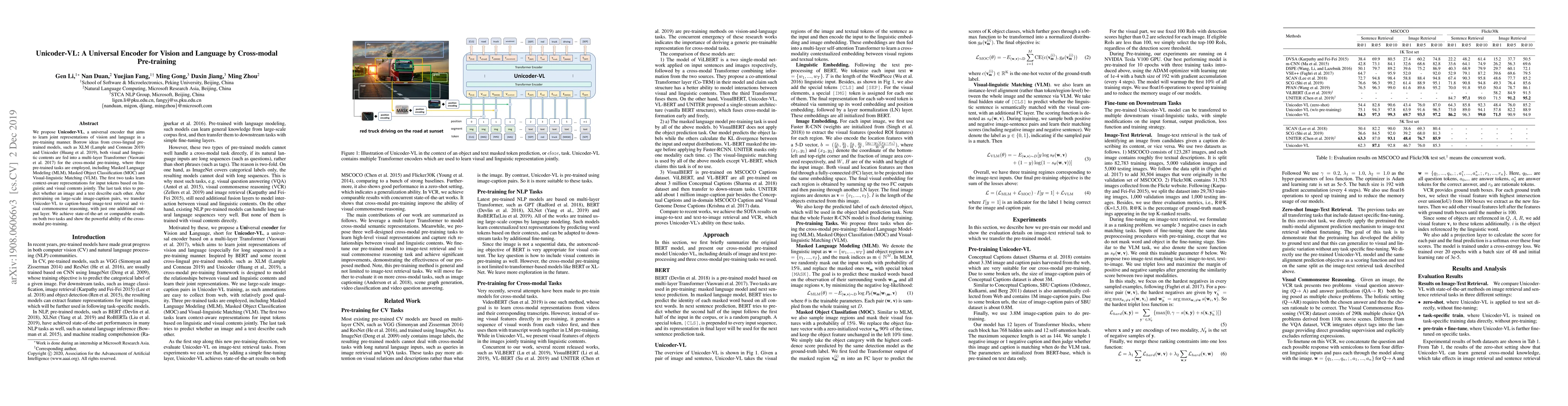 Unicoder-VL is a universal encoder developed for joint vision and language representation through cross-modal pre-training using a multi-layer Transformer, achieving state-of-the-art results in caption-based image-text retrieval and visual commonsense reasoning.