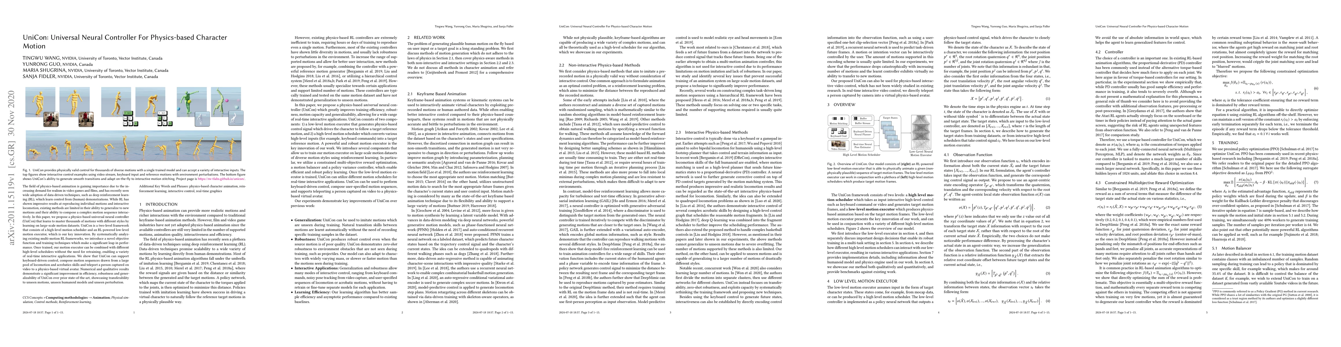 This paper introduces UniCon, a universal neural controller for physics-based character motion, which leverages deep reinforcement learning to master diverse motions from large datasets. The proposed two-level framework enables efficient composition and real-time interaction, demonstrating significant improvements in efficiency, robustness, and generalizability over existing methods.