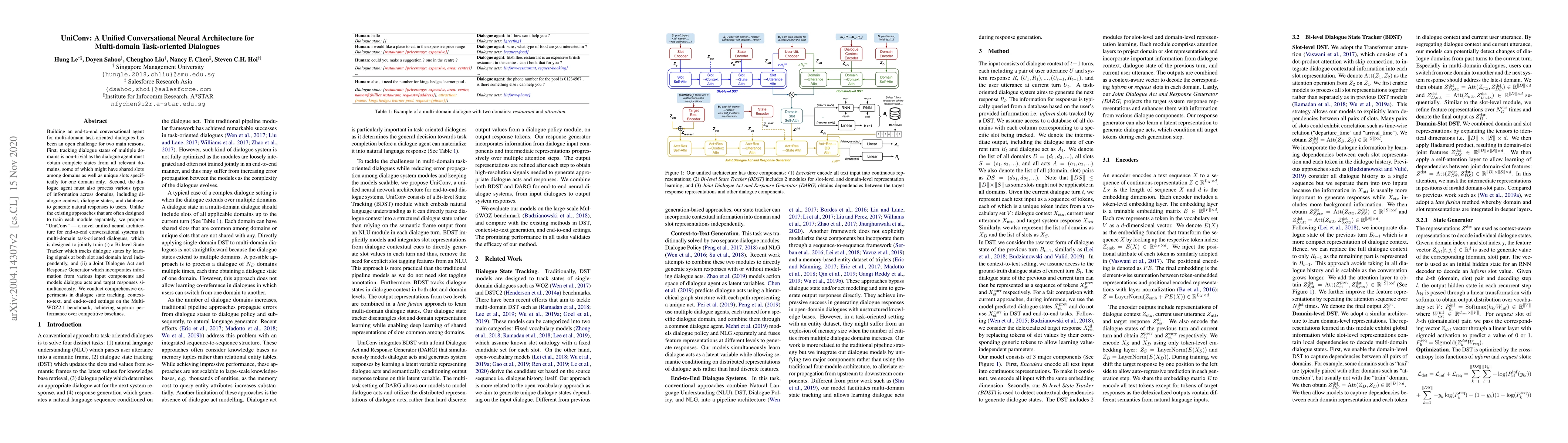UniConv presents a unified neural architecture for multi-domain task-oriented dialogues, jointly training a Bi-level State Tracker and a Joint Dialogue Act and Response Generator, achieving superior performance on the MultiWOZ2.1 benchmark. This approach addresses the complexities of tracking dialogue states and generating natural responses across multiple domains.