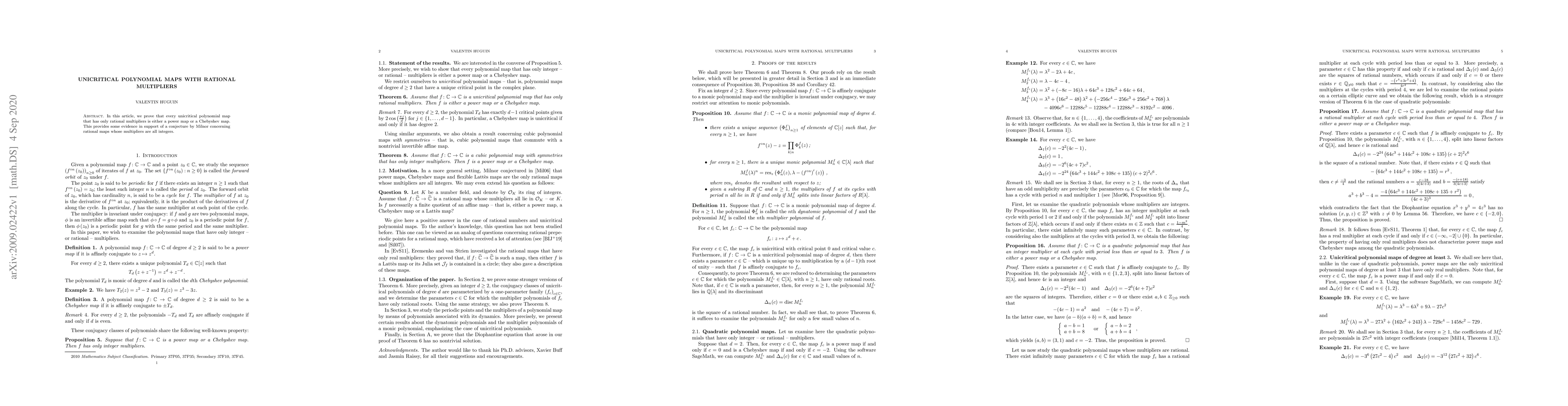 Summary: The paper demonstrates that unicritical polynomial maps with rational multipliers are either power maps or Chebyshev maps, supporting a conjecture by Milnor about integer multipliers in rational maps.