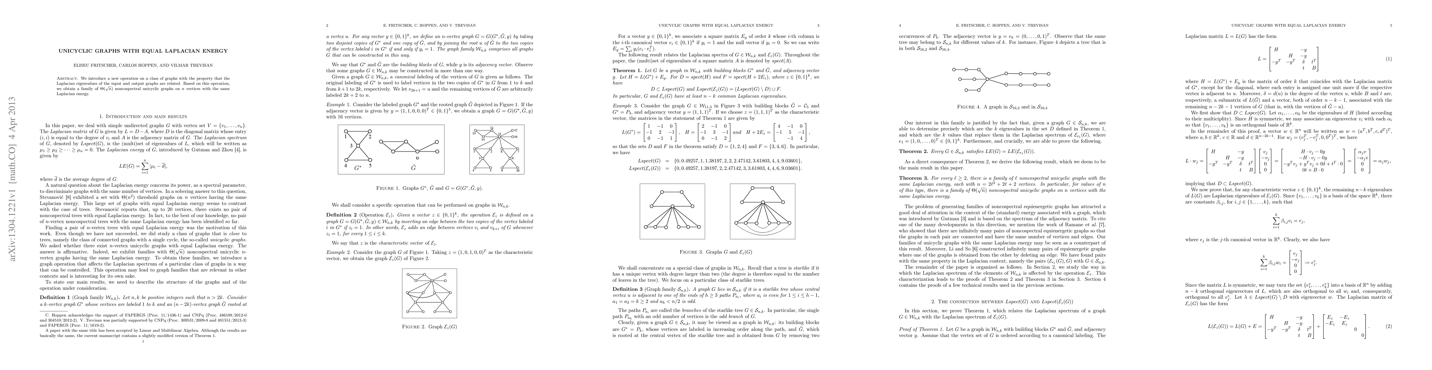 Summary: This paper presents a novel graph operation that maintains a relationship between Laplacian eigenvalues, leading to a family of noncospectral unicyclic graphs on n vertices, each with order √n and equal Laplacian energy.