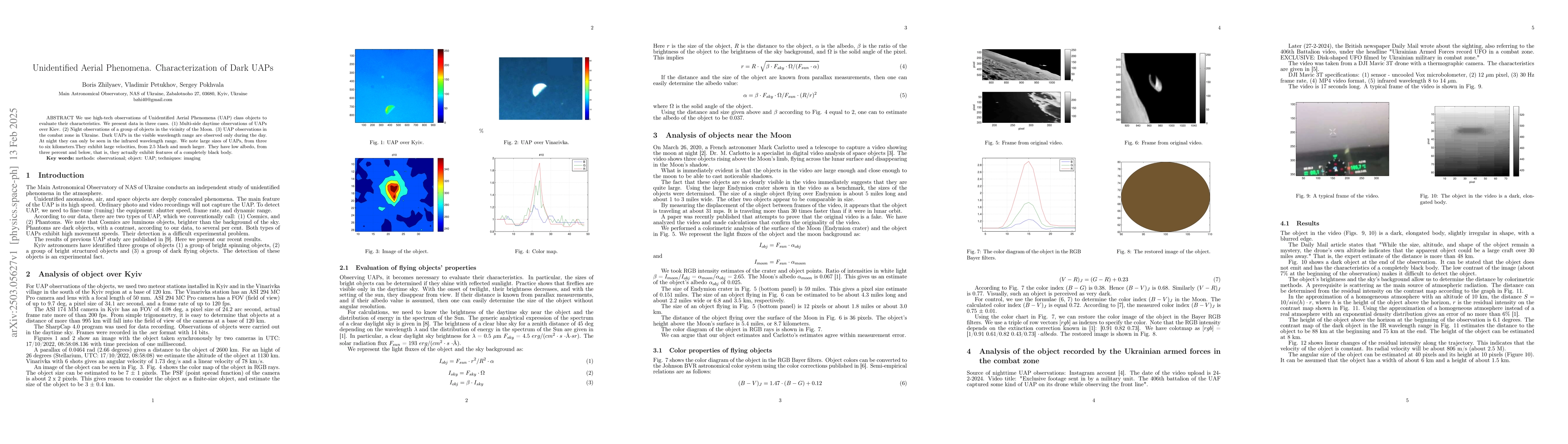 The research utilized high-tech observations of Unidentified Aerial Phenomena (UAP) class objects, including multi-side daytime observations over Kiev, night observations near the Moon, and observations in a combat zone in Ukraine. It employed parallax measurements, colorimetric analysis, and infrared imaging to evaluate the characteristics of these dark UAPs.