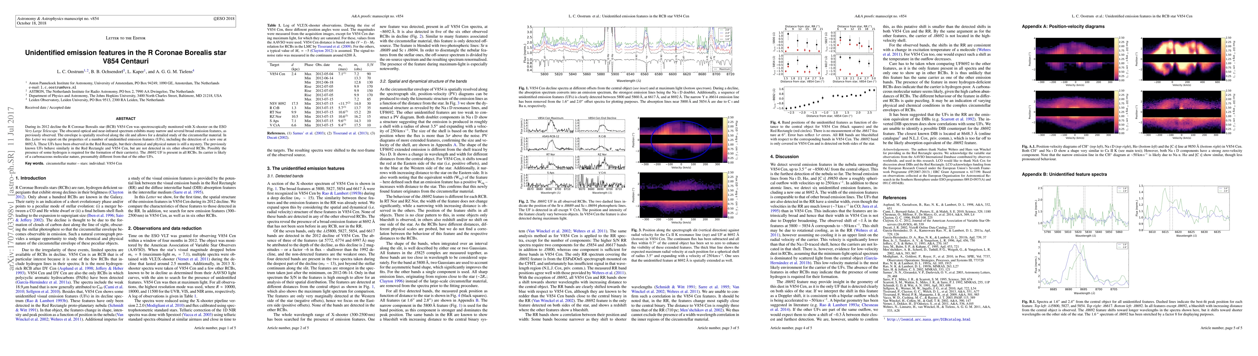 During its 2012 decline the R Coronae Borealis star (RCB) V854 Cen was spectroscopically monitored with X-shooter on the ESO Very Large Telescope. The obscured optical and near-infrared spectrum exhibits many narrow and several broad emission features, as previously observed. The envelope is spatially resolved along the slit and allows for a detailed study of the circumstellar material. In this Letter we report on the properties of a number of unidentified emission features (UFs), including the detection of a new one at 8692 {\AA}. These UFs have been observed in the Red Rectangle, but their chemical and physical nature is still a mystery. The previously known UFs behave similarly in the Red Rectangle and V854 Cen, but are not detected in six other observed RCBs. Possibly the presence of some hydrogen is required for the formation of their carrier(s). The $\lambda 8692$ UF is present in all RCBs. Its carrier is likely of a carbonaceous molecular nature, presumably different from that of the other UFs.
