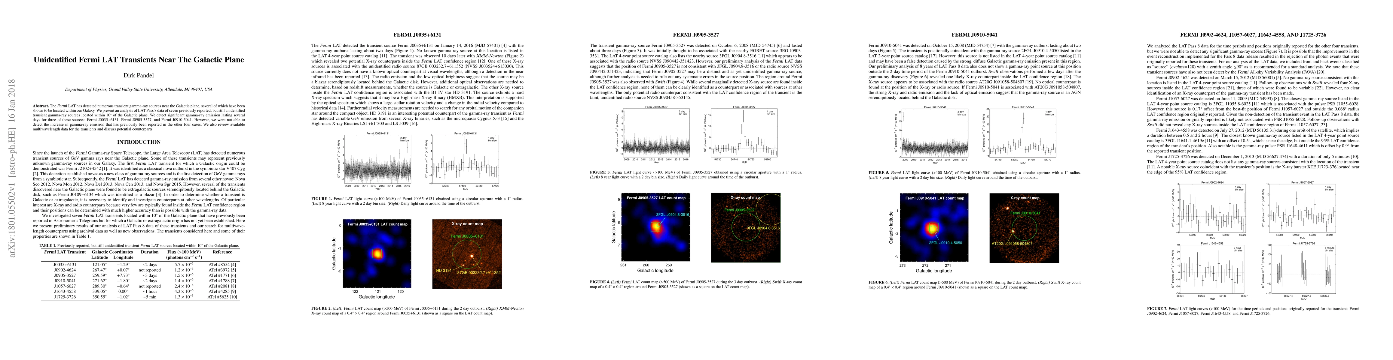 This study analyzes Fermi LAT data to identify three transient gamma-ray sources—Fermi J0035+6131, Fermi J0905-3527, and Fermi J0910-5041—showing significant gamma-ray emission near the Galactic plane, while failing to confirm previous reports of increased emission in the other four sources. The paper also examines multiwavelength data to explore potential counterparts.