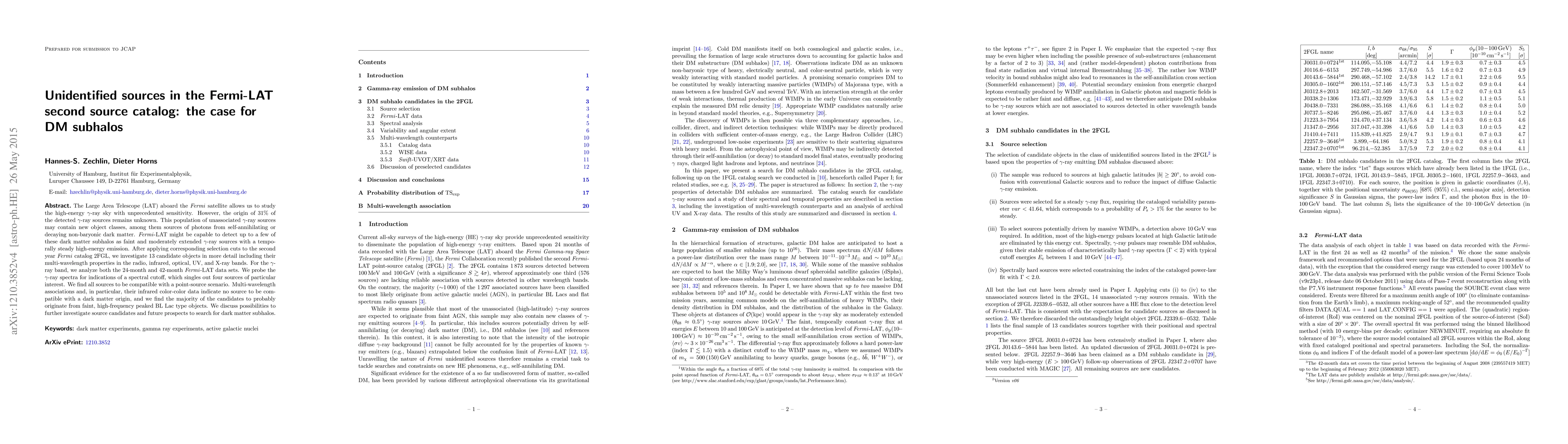 The Large Area Telescope (LAT) aboard the Fermi satellite allows us to study the high-energy gamma-ray sky with unprecedented sensitivity. However, the origin of 31% of the detected gamma-ray sources remains unknown. This population of unassociated gamma-ray sources may contain new object classes, among them sources of photons from self-annihilating or decaying non-baryonic dark matter. Fermi-LAT might be capable to detect up to a few of these dark matter subhalos as faint and moderately extended gamma-ray sources with a temporally steady high-energy emission. After applying corresponding selection cuts to the second year Fermi catalog 2FGL, we investigate 13 candidate objects in more detail including their multi-wavelength properties in the radio, infrared, optical, UV, and X-ray bands. For the gamma-ray band, we analyze both the 24-month and 42-month Fermi-LAT data sets. We probe the gamma-ray spectra for indications of a spectral cutoff, which singles out four sources of particular interest. We find all sources to be compatible with a point-source scenario. Multi-wavelength associations and, in particular, their infrared color-color data indicate no source to be compatible with a dark matter origin, and we find the majority of the candidates to probably originate from faint, high-frequency peaked BL Lac type objects. We discuss possibilities to further investigate source candidates and future prospects to search for dark matter subhalos.