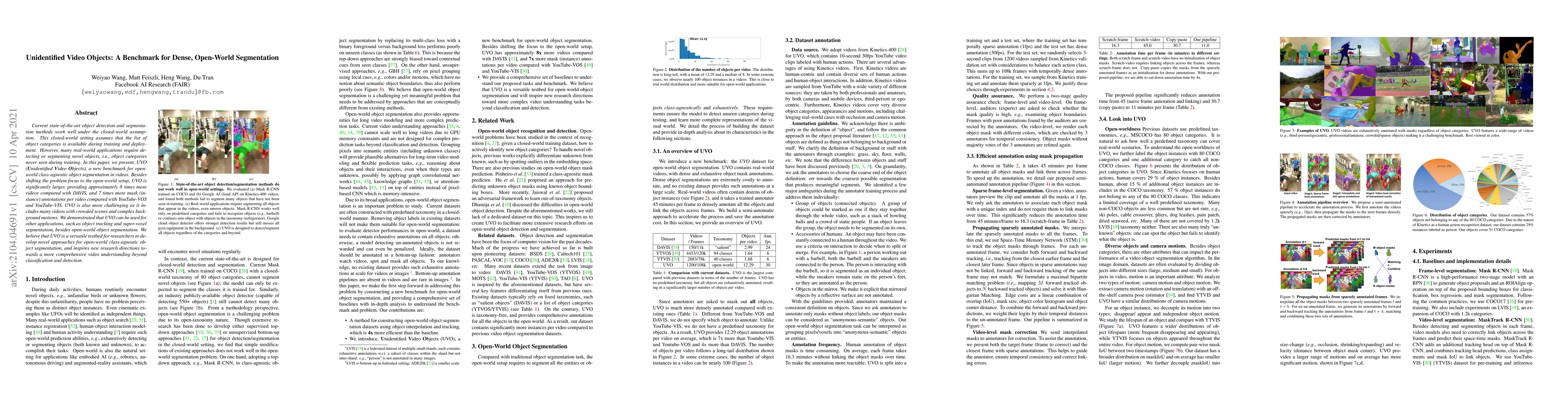 This paper introduces UVO (Unidentified Video Objects), a new benchmark for open-world, class-agnostic object segmentation in videos, addressing the limitations of current closed-world detection methods. UVO provides significantly larger and more challenging data compared to existing benchmarks, aiming to inspire research in open-world segmentation and related applications.