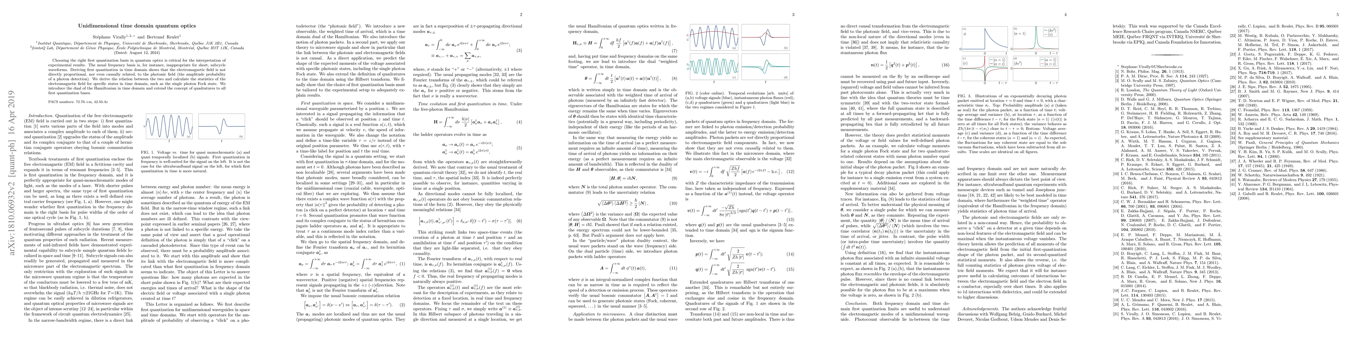 Choosing the right first quantization basis in quantum optics is critical for the interpretation of experimental results. The usual frequency basis is, for instance, inappropriate for short, subcycle waveforms. Deriving first quantization in time domain shows that the electromagnetic field is not directly proportional, nor even causally related, to the photonic field (the amplitude probability of a photon detection). We derive the relation between the two and calculate the statistics of the electromagnetic field for specific states in time domain, such as the single photon Fock state. We introduce the dual of the Hamiltonian in time domain and extend the concept of quadratures to all first quantization bases.