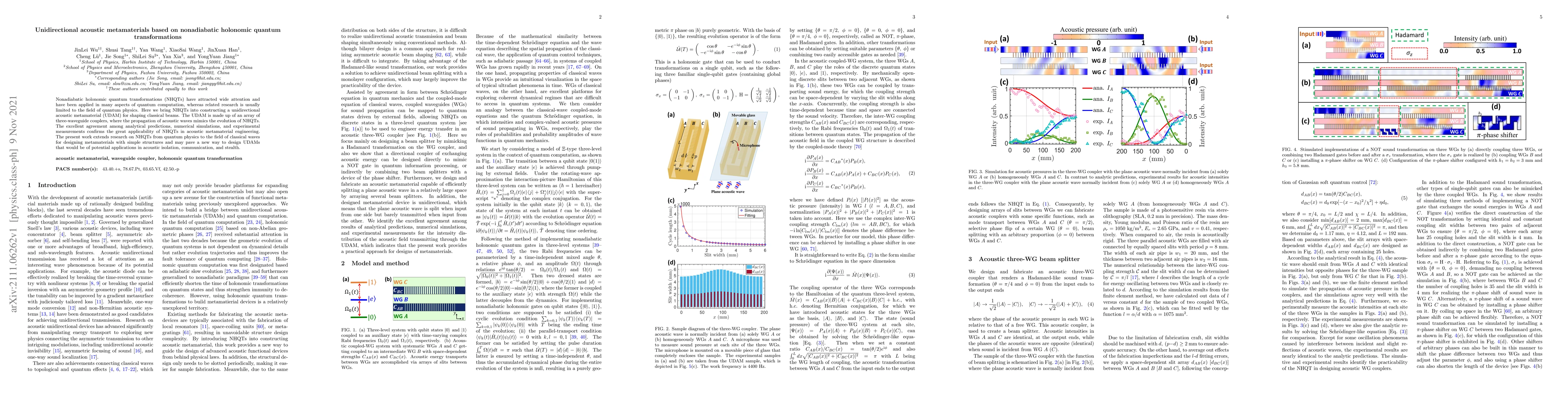 This paper introduces unidirectional acoustic metamaterials (UDAMs) constructed using nonadiabatic holonomic quantum transformations (NHQTs), demonstrating the application of quantum concepts to classical acoustic wave manipulation. The UDAMs, composed of three-waveguide couplers, show promising potential for acoustic isolation, communication, and stealth applications.