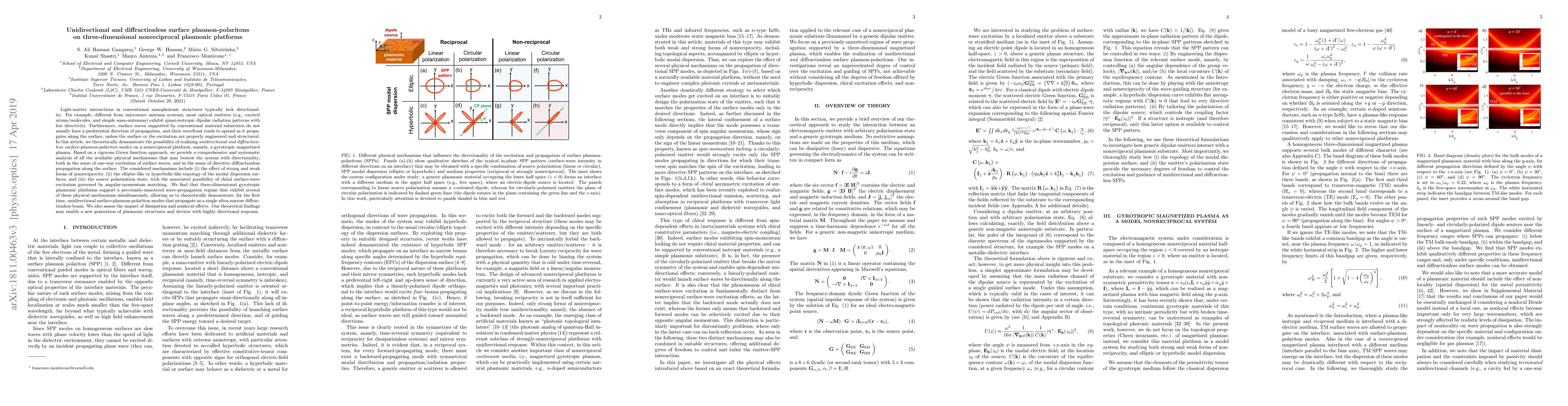 Light-matter interactions in conventional nanophotonic structures typically lack directionality. Furthermore, surface waves supported by conventional material substrates do not usually have a preferential direction of propagation, and their wavefront tends to spread as it propagates along the surface, unless the surface or the excitation are properly engineered and structured. In this article, we theoretically demonstrate the possibility of realizing \emph{unidirectional and diffractionless surface-plasmon-polariton modes} on a nonreciprocal platform, namely, a gyrotropic magnetized plasma. Based on a rigorous Green function approach, we provide a comprehensive and systematic analysis of all the available physical mechanisms that may bestow the system with directionality, both in the sense of one-way excitation of surface waves, and in the sense of directive diffractionless propagation along the surface. The considered mechanisms include (i) the effect of strong and weak forms of nonreciprocity, (ii) the elliptic-like or hyperbolic-like topology of the modal dispersion surfaces, and (iii) the source polarization state, with the associated possibility of chiral surface-wave excitation governed by angular-momentum matching. We find that three-dimensional gyrotropic plasmonic platforms support a previously-unnoticed wave-propagation regime that exhibit several of these physical mechanisms simultaneously, allowing us to theoretically demonstrate, for the first time, unidirectional surface-plasmon-polariton modes that propagate as a single ultra-narrow diffractionless beam. We also assess the impact of dissipation and nonlocal effects. Our theoretical findings may enable a new generation of plasmonic structures and devices with highly directional response.
