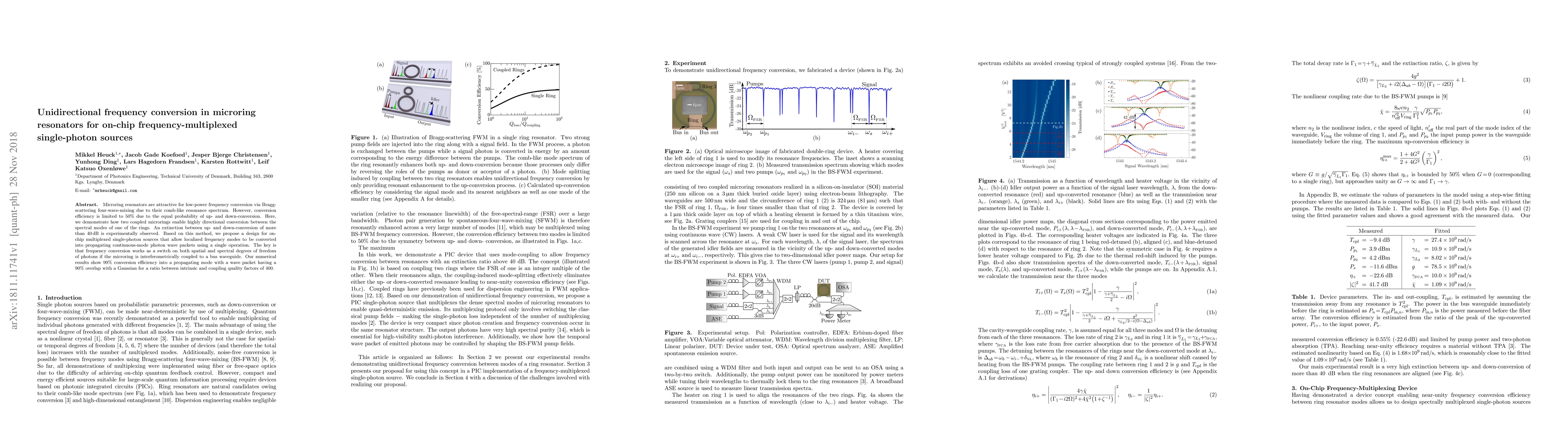 This paper demonstrates a method using two coupled microring resonators to achieve highly directional frequency conversion with over 40 dB extinction ratio, enabling 99% efficiency for on-chip multiplexed single-photon sources. The technique leverages interferometric coupling to switch between spectral modes with minimal up- and down-conversion.
