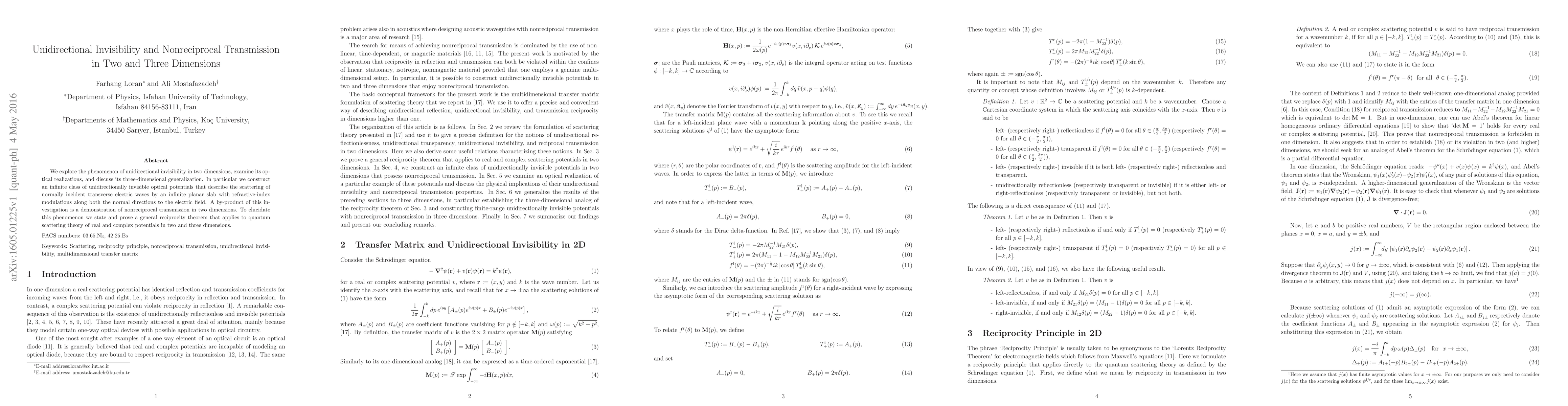 This paper investigates unidirectional invisibility in two dimensions and extends it to three dimensions, constructing optical potentials that enable nonreciprocal transmission. It also proves a general reciprocity theorem applicable to quantum scattering theory across dimensions.