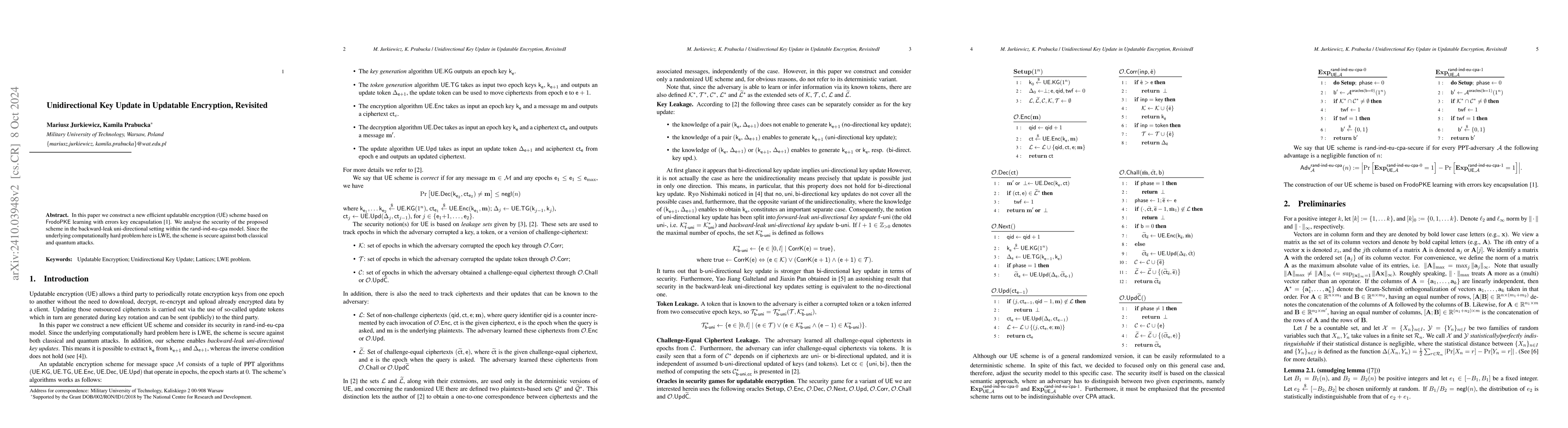 The paper introduces an efficient updatable encryption scheme based on FrodoPKE and analyzes its security in the backward-leak unidirectional setting under the rand-ind-eu-cpa model, leveraging the security of the LWE problem to resist both classical and quantum attacks.