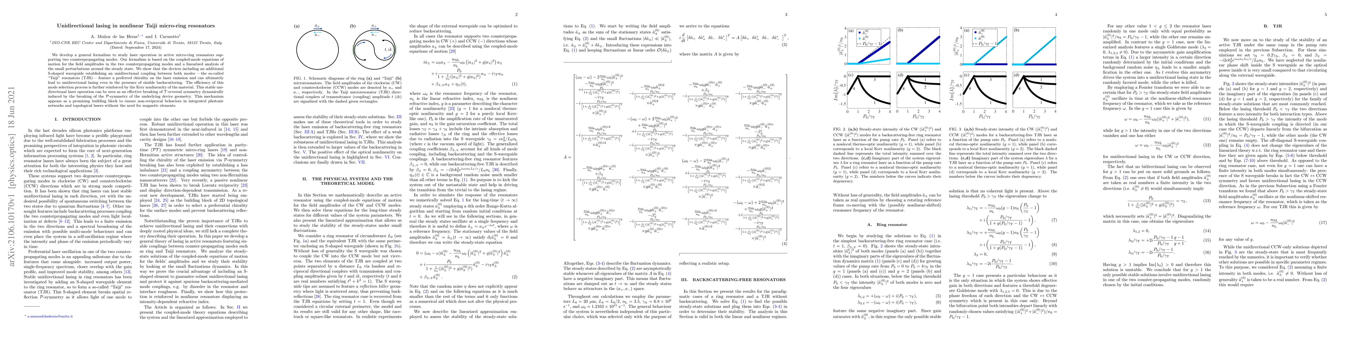 We develop a general formalism to study laser operation in active micro-ring resonators supporting two counterpropagating modes. Our formalism is based on the coupled-mode equations of motion for the field amplitudes in the two counterpropagating modes and a linearized analysis of the small perturbations around the steady state. We show that the devices including an additional S-shaped waveguide establishing an unidirectional coupling between both modes -- the so-called Taiji resonators (TJR) -- feature a preferred chirality on the laser emission and can ultimately lead to unidirectional lasing even in the presence of sizable backscattering. The efficiency of this mode selection process is further reinforced by the Kerr nonlinearity of the material. This stable unidirectional laser operation can be seen as an effective breaking of $\mathcal{T}$-reversal symmetry dynamically induced by the breaking of the $\mathcal{P}$-symmetry of the underlying device geometry. This mechanism appears as a promising building block to ensure non-reciprocal behaviors in integrated photonic networks and topological lasers without the need for magnetic elements.