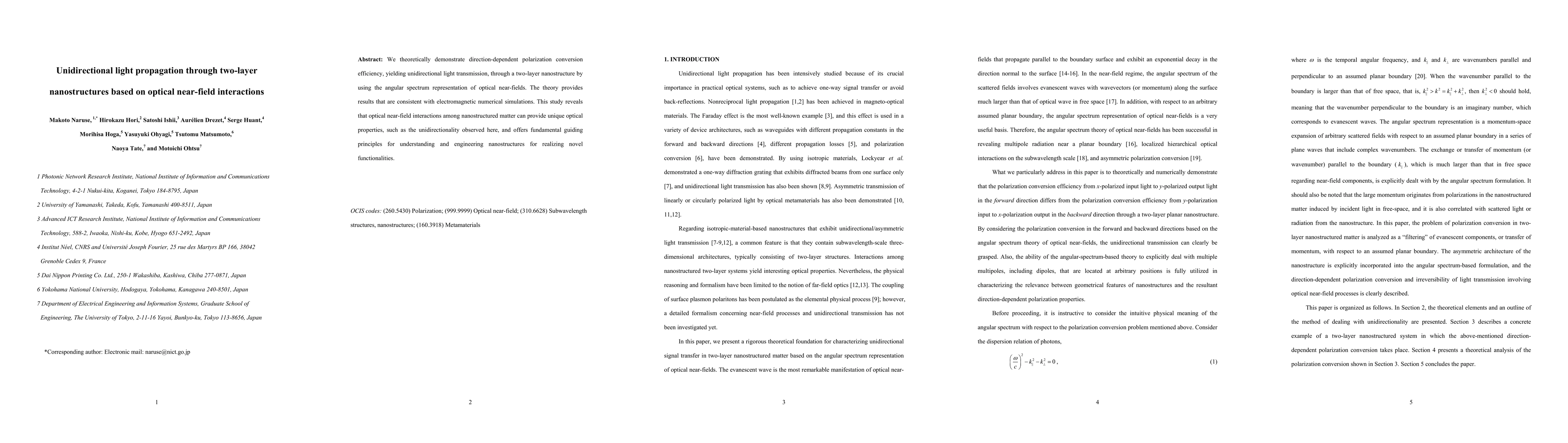 This paper theoretically demonstrates unidirectional light transmission through a two-layer nanostructure via optical near-field interactions, achieving direction-dependent polarization conversion. The findings provide fundamental principles for designing nanostructures with unique optical properties, validated by electromagnetic simulations.