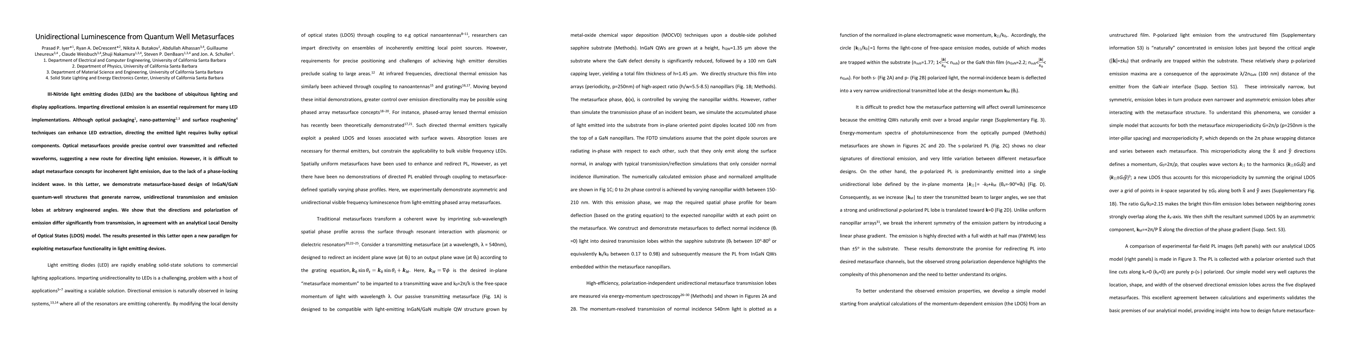 This paper demonstrates metasurface-based quantum-well structures that enable narrow, unidirectional emission from III-Nitride LEDs, overcoming the need for bulky optical components. The study shows distinct emission directions and polarizations compared to transmission, validated by a Local Density of Optical States model.