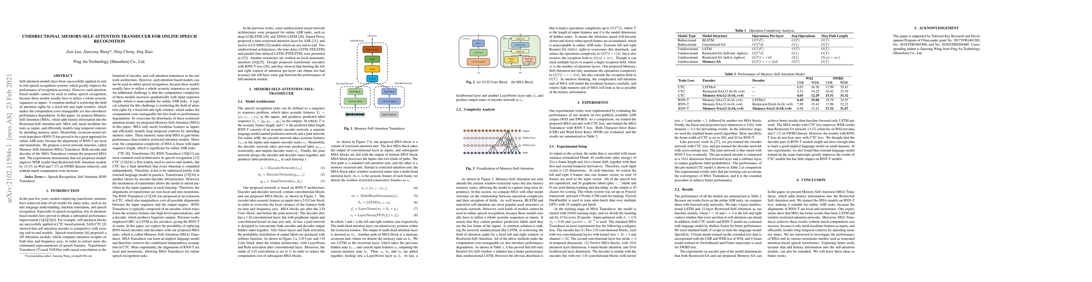 This paper proposes a Memory-Self-Attention Transducer for online speech recognition, integrating history information into Restricted-Self-Attention to model long temporal contexts efficiently. The model improves Word Error Rate results by 13.5% on WSJ and 7.1% on SWBD datasets compared to Restricted-Self-Attention models, with minimal additional computational costs.