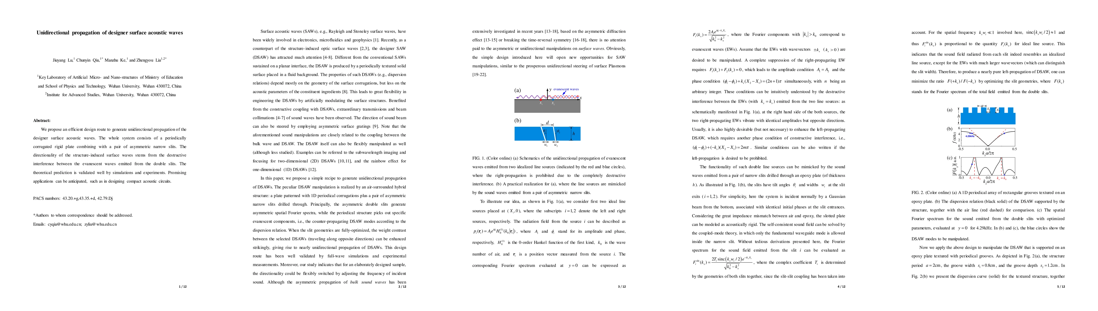 This paper proposes a method to generate unidirectional surface acoustic waves using a periodically corrugated rigid plate with asymmetric slits, achieving directionality through destructive interference. The design is validated through simulations and experiments, with potential applications in compact acoustic circuits.