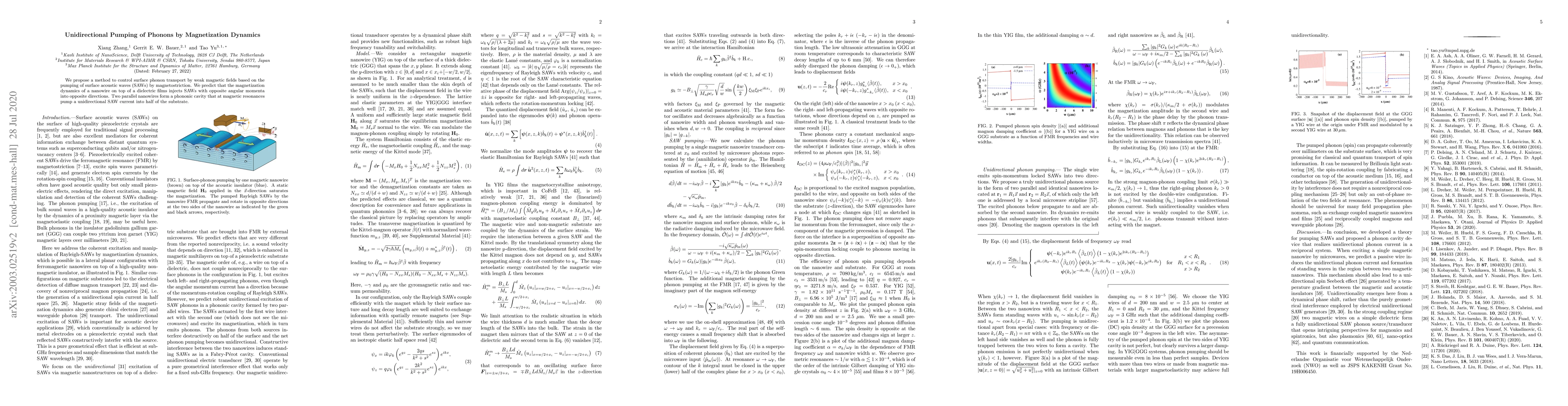 We propose a method to control surface phonon transport by weak magnetic fields based on the pumping of surface acoustic waves (SAWs) by magnetostriction. We predict that the magnetization dynamics of a nanowire on top of a dielectric films injects SAWs with opposite angular momenta into opposite directions. Two parallel nanowires form a phononic cavity that at magnetic resonances pump a unidirectional SAW current into half of the substrate.