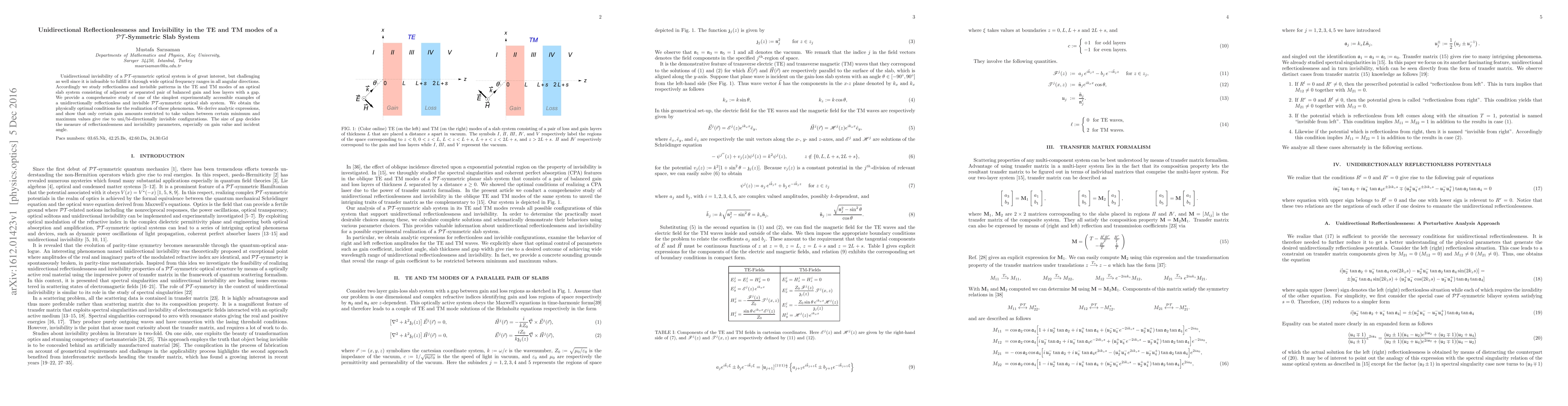 This paper investigates unidirectional reflectionlessness and invisibility in TE and TM modes of a PT-symmetric optical slab system, demonstrating optimal conditions for these phenomena through balanced gain and loss layers. The study reveals that specific gain values and gap sizes are crucial for achieving these effects, providing analytic expressions for their realization.