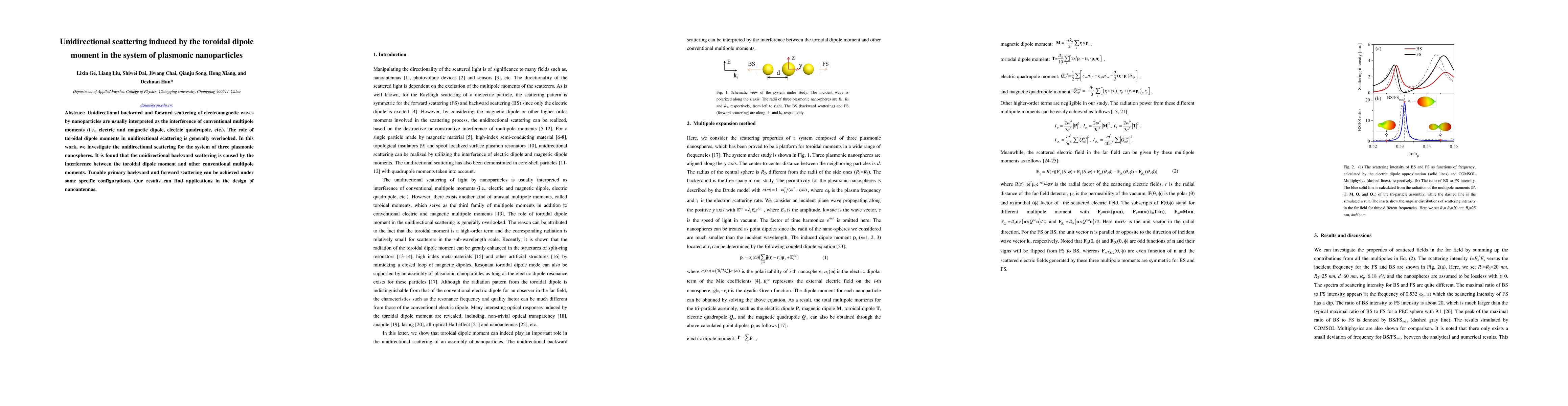 This paper investigates how toroidal dipole moments in plasmonic nanospheres contribute to unidirectional scattering, demonstrating that such moments can induce both backward and forward scattering when interacting with conventional multipoles. The findings suggest tunable scattering properties that could enhance nanoantenna design.