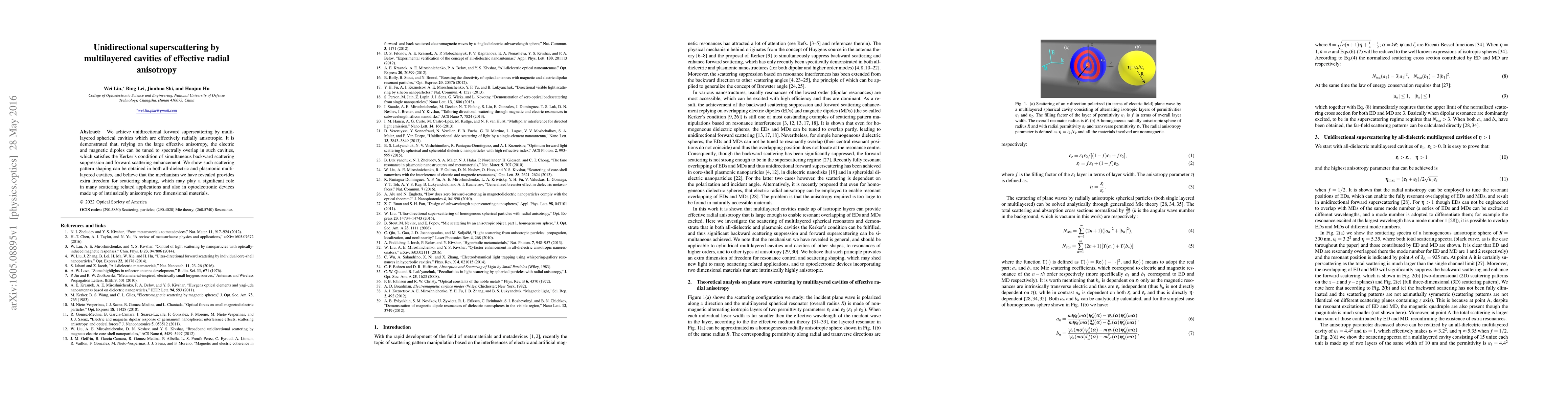 This paper demonstrates unidirectional forward superscattering using multilayered spherical cavities with effective radial anisotropy, enabling the tuning of electric and magnetic dipoles to overlap spectrally. This approach satisfies Kerker's condition, potentially offering new flexibility for scattering manipulation in optoelectronic devices and applications.