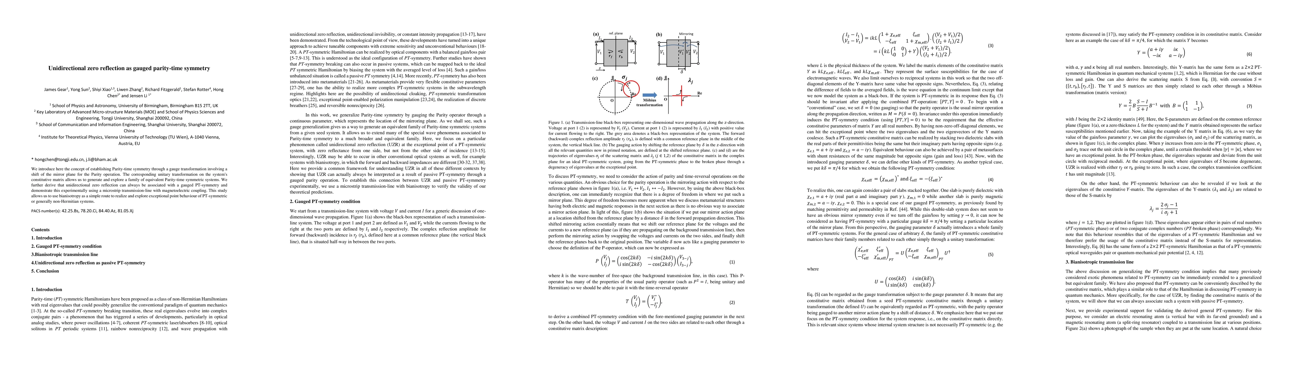 This paper introduces a gauged parity-time symmetry method using a shift in the mirror plane, enabling unidirectional zero reflection and exceptional point behavior in non-Hermitian systems. Experimental validation is demonstrated using a microstrip transmission line with magnetoelectric coupling.