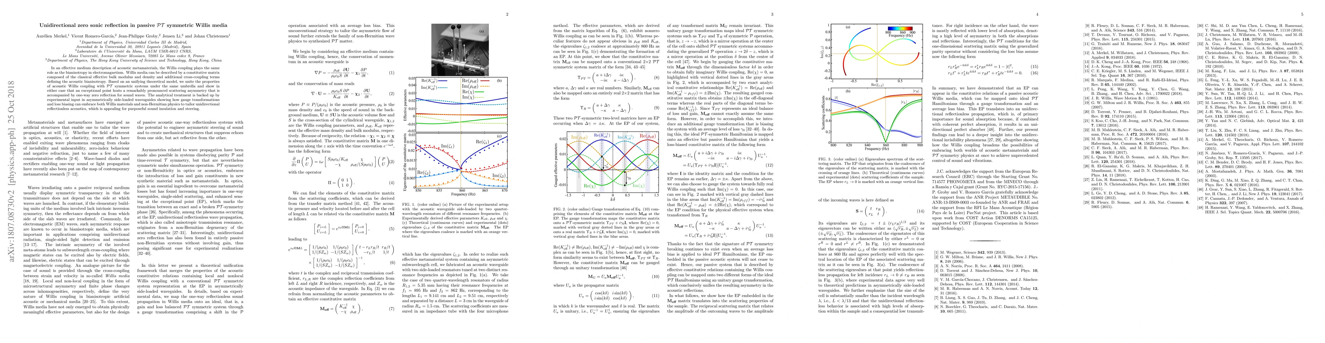 This paper demonstrates that combining Willis coupling in acoustic metamaterials with $\mathcal{PT}$ symmetric systems leads to unidirectional zero sonic reflection, facilitated by exceptional points. Experimental results in waveguides validate the theoretical model, suggesting practical applications for sound insulation and directional sound control.