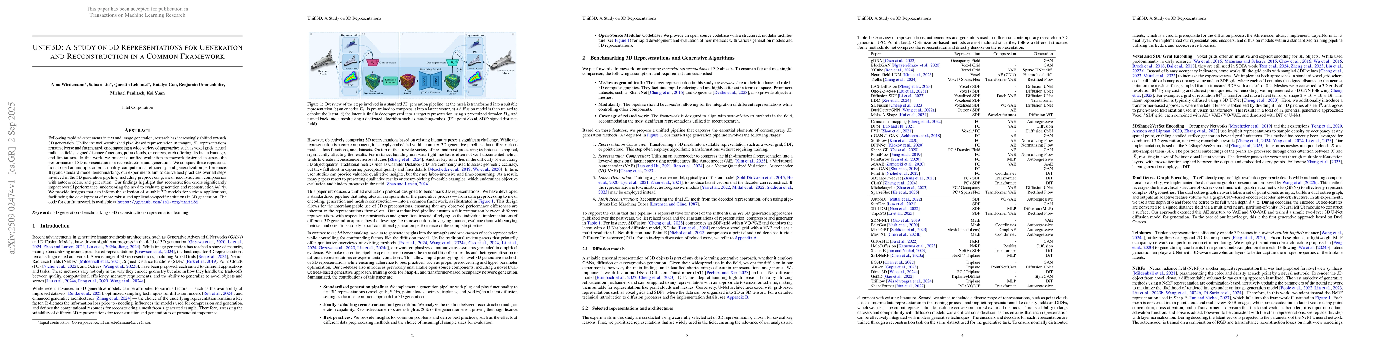 Following rapid advancements in text and image generation, research has increasingly shifted towards 3D generation. Unlike the well-established pixel-based representation in images, 3D representations remain diverse and fragmented, encompassing a wide variety of approaches such as voxel grids, neural radiance fields, signed distance functions, point clouds, or octrees, each offering distinct advantages and limitations. In this work, we present a unified evaluation framework designed to assess the performance of 3D representations in reconstruction and generation. We compare these representations based on multiple criteria: quality, computational efficiency, and generalization performance. Beyond standard model benchmarking, our experiments aim to derive best practices over all steps involved in the 3D generation pipeline, including preprocessing, mesh reconstruction, compression with autoencoders, and generation. Our findings highlight that reconstruction errors significantly impact overall performance, underscoring the need to evaluate generation and reconstruction jointly. We provide insights that can inform the selection of suitable 3D models for various applications, facilitating the development of more robust and application-specific solutions in 3D generation. The code for our framework is available at https://github.com/isl-org/unifi3d.