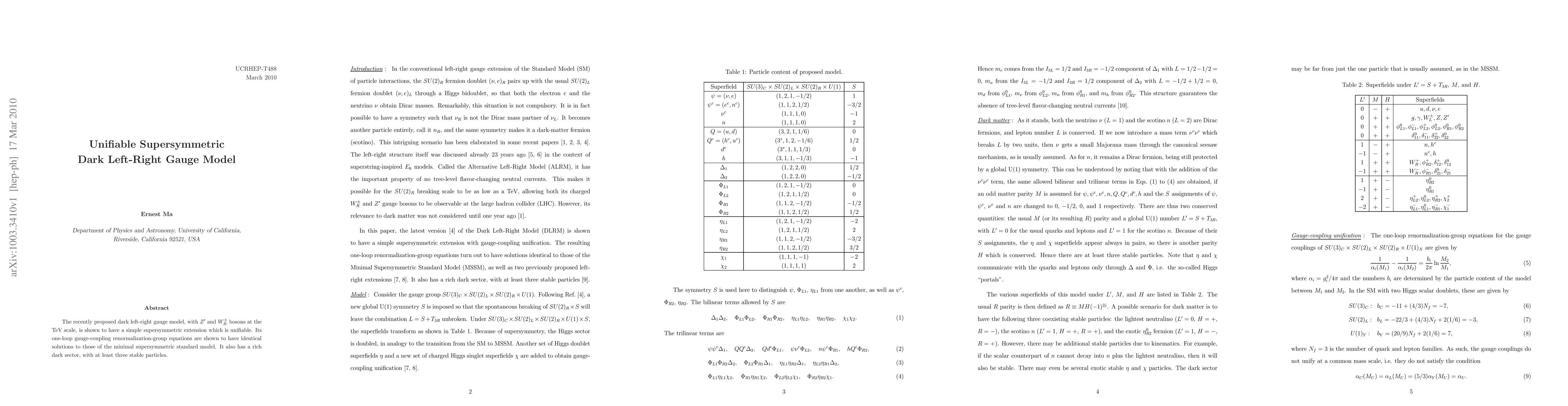 The paper proposes a supersymmetric extension of the dark left-right gauge model, demonstrating its unification with the minimal supersymmetric standard model through identical one-loop gauge-coupling solutions. It also introduces a rich dark sector with at least three stable particles.