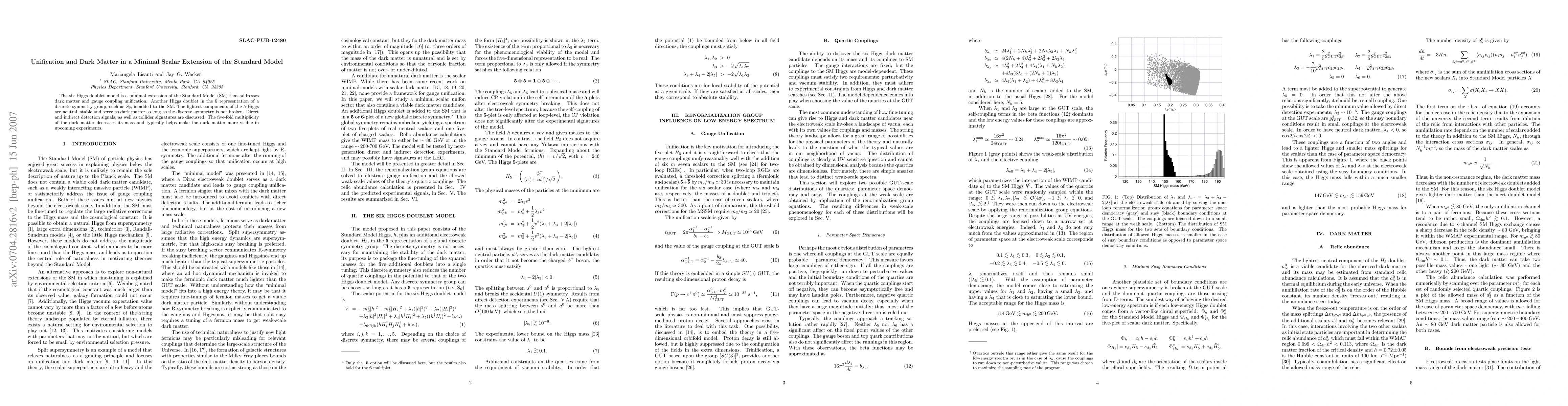 The six Higgs doublet model is a minimal extension of the Standard Model that addresses dark matter and gauge coupling unification. Another Higgs doublet in a 5 representation of a discrete symmetry group, such as S_6, is added to the SM. The lightest components of the 5-Higgs are neutral, stable and serve as dark matter so long as the discrete symmetry is not broken. Direct and indirect detection signals, as well as collider signatures are discussed. The five-fold multiplicity of the dark matter decreases its mass and typically helps make the dark matter more visible in upcoming experiments.