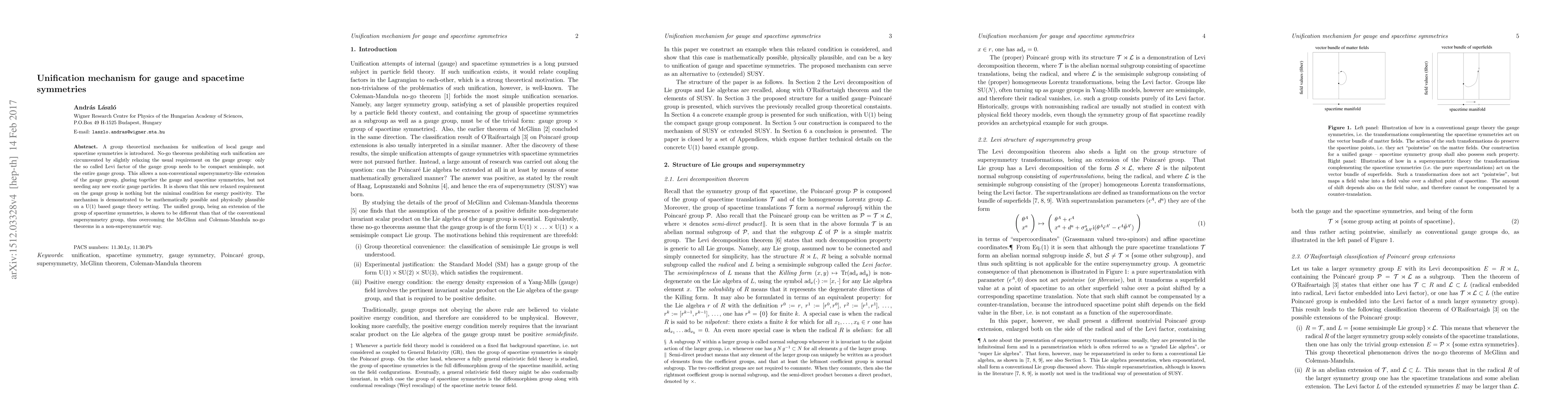 This paper proposes a novel group theoretical mechanism to unify local gauge and spacetime symmetries by relaxing the compactness requirement on the gauge group to only its Levi factor. This approach circumvents existing no-go theorems and allows for a non-conventional supersymmetry-like extension without introducing exotic gauge particles, demonstrating its feasibility in a U(1) gauge theory setting.