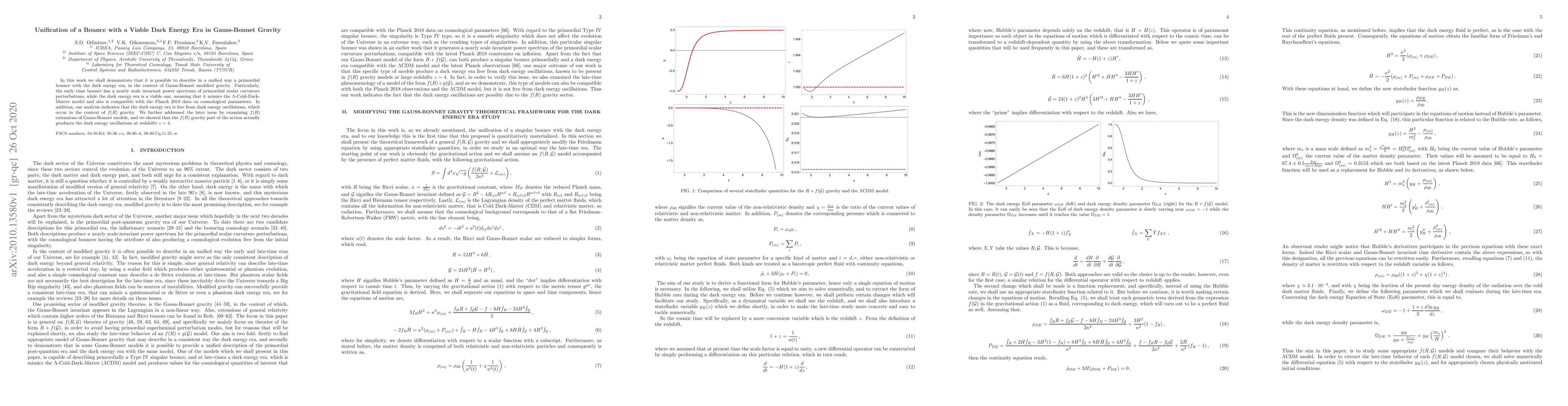 In this work we shall demonstrate that it is possible to describe in a unified way a primordial bounce with the dark energy era, in the context of Gauss-Bonnet modified gravity. Particularly, the early time bounce has a nearly scale invariant power spectrum of primordial scalar curvature perturbations, while the dark energy era is a viable one, meaning that it mimics the $\Lambda$-Cold-Dark-Matter model and also is compatible with the Planck 2018 data on cosmological parameters. In addition, our analysis indicates that the dark energy era is free from dark energy oscillations, which occur in the context of $f(R)$ gravity. We further addressed the later issue by examining $f(R)$ extensions of Gauss-Bonnet models, and we showed that the $f(R)$ gravity part of the action actually produces the dark energy oscillations at redshifts $z\sim 4$.