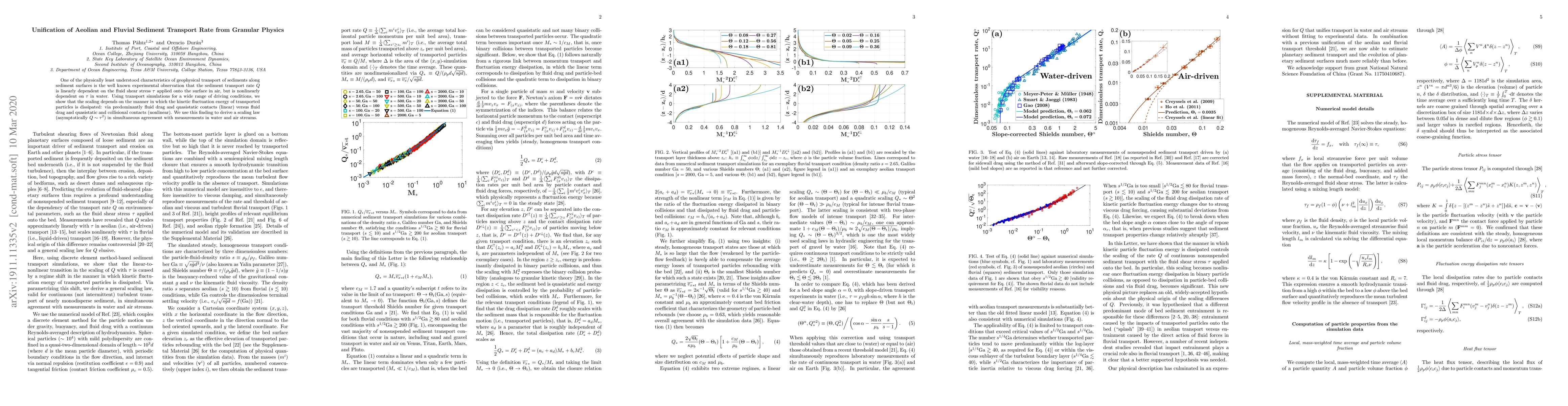 This paper proposes a granular physics-based scaling law unifying the sediment transport rate in both air and water, explaining the differing linear and nonlinear dependencies on fluid shear stress. The key insight is that the dissipation of kinetic fluctuation energy through different contact mechanisms governs the transport behavior.