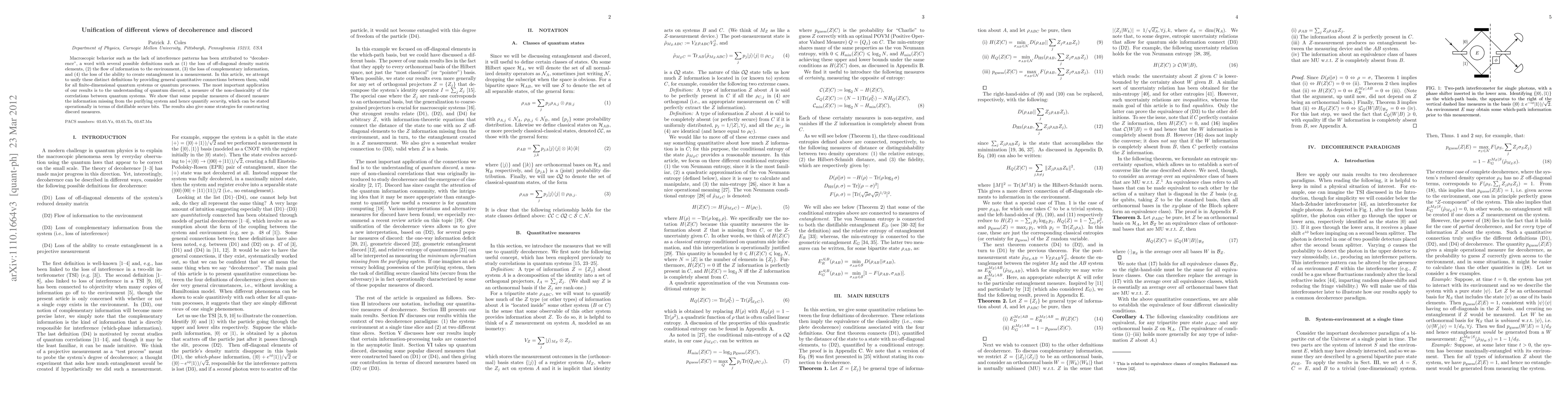 Macroscopic behavior such as the lack of interference patterns has been attributed to "decoherence", a word with several possible definitions such as (1) the loss of off-diagonal density matrix elements, (2) the flow of information to the environment, (3) the loss of complementary information, and (4) the loss of the ability to create entanglement in a measurement. In this article, we attempt to unify these distinct definitions by providing general quantitative connections between them, valid for all finite-dimensional quantum systems or quantum processes. The most important application of our results is to the understanding of quantum discord, a measure of the non-classicality of the correlations between quantum systems. We show that some popular measures of discord measure the information missing from the purifying system and hence quantify security, which can be stated operationally in terms of distillable secure bits. The results also give some strategies for constructing discord measures.